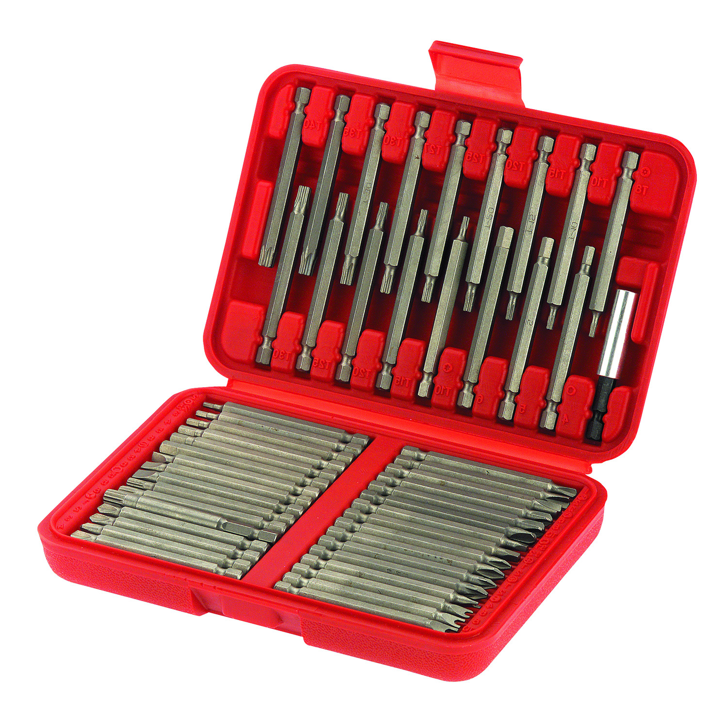 Bit- Set Spezial 75 mm, 50-Teilig, für Arbeiten an Schrauben aller Art, insb. Sicherheits- und Spezialschrauben, Dank Überlänge von 75 mm hervorragend geeignet auch an wenig zugänglichen Stellen bei beengten Platzverhältnissen, mit Standard-Sechskant-Aufnahme 1/4" für Akkuschrauber- und Handschrauber-Betrieb, aus Chrom-Vanadium-Stahl, übersichtlich und verrutschsicher aufbewahrt in schlagfester Kunststoffbox (195 x 135 x 38 mm). Inhalt: Je 1 Stück Schraub-Bits; Universal-Bithalter, mit 1/4"-Sechskant-Aufnahme und Dauermagnet, Länge 60 mm. Schlitz 4 mm- 5 mm-6 mm; Schlitz mit Aussparung (Spanner / Klauenschlüssel) 4 mm- 6 mm- 8 mm-10 mm; Kreuzschlitz Phillips PH1- PH2; Kreuzschlitz Pozidriv PZ1- PZ2; Innen-Vierkant (Robertson) Gr.1- Gr.2; Innen-Sechskant 4 mm- 5 mm-6 mm; Innen-Sechskant 4 mm-5 mm-6 mm; Innen-Sechskant mit Bohrung (Tamper Resistant) 2 mm- 2,5 mm- 3 mm - 4 mm- 5 mm- 6 mm; Bits für TX- Schrauben T 10- T -15 -T -20 T -25 T- 30; Bits für TX-Schrauben mit Bohrung (Tamper Resistant) T 8TR-T10TR-T15TR-T20TR-T25TR-T27TR-T30TR-T-35-T40TR; Vierflügel (Torq-Set) TS6- TS8- TS10; Dreiflügel (TRI-WING) TW1- TW2 -TW-3 TW4; Zweiflügel (Klammer-Bits / Clutch) C 1- C 2 -C 3; XZN Vielzahn Gr. 5- Gr. 6- Gr. 8.- Hersteller-Artikelnummer (MPN)