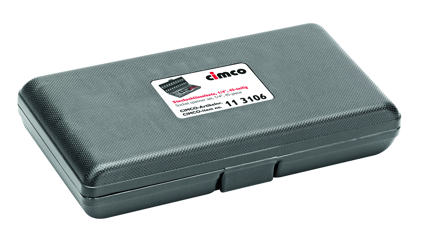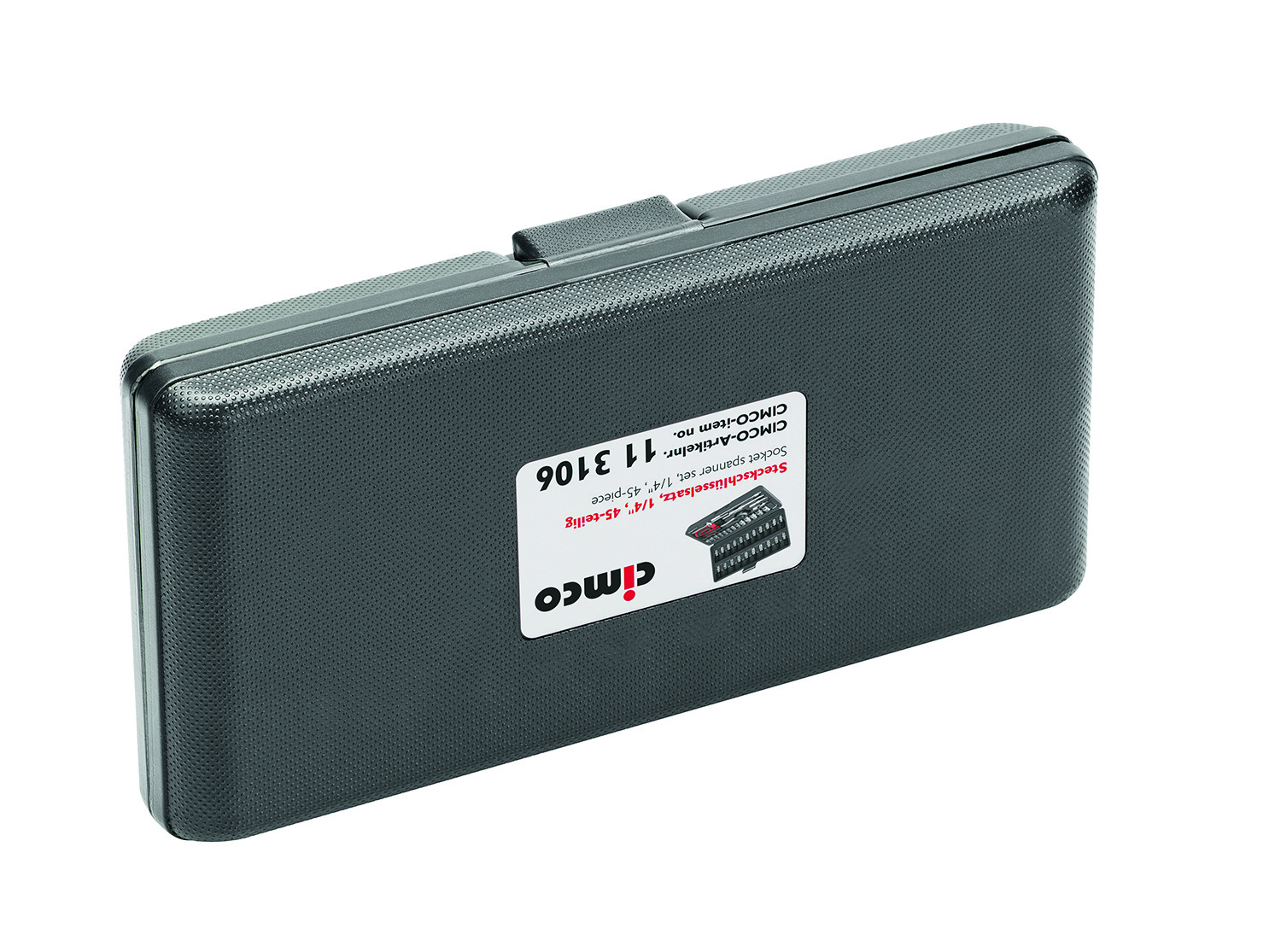 Steckschlüssel-Satz, 45-teilig in einer ansprechend, kompakter Kunststoffbox. 6,3 mm (1/4") Antrieb, aus Chrom-Vanadium-Stahl. Einsätze in Sechskant für ein maximales Drehmoment, Hebelumschaltknarre mit Einsatzschnelllöser. 72 Zähne. Inhalt: Sechskant Einsätze: 4 - 4,5 - 5 - 5,5 - 6 - 7 - 8 - 9 - 10 - 12 - 13 - 14 mm; Kreuzeinsatz: PH1 - PH2 - PH3 - PZ1, PZ2, PZ3; Schlitzeinsatz: 4 - 5,5 - 7 mm; für TX-Schrauben T10 T15 T20 T25 T30 T40; Innensechskanteinsätze 3 4 5 6 7 8 mm; Biegsame Welle 150 mm; Kardangelenk; Verlängerungen in 50 und 100 mm; Handgriff 1/4"; Adapter 1/4''; Quergriff mit Gleitkopf (1/4"); Innensechskant-Winkelschlüssel 1,5 2 3 mm.