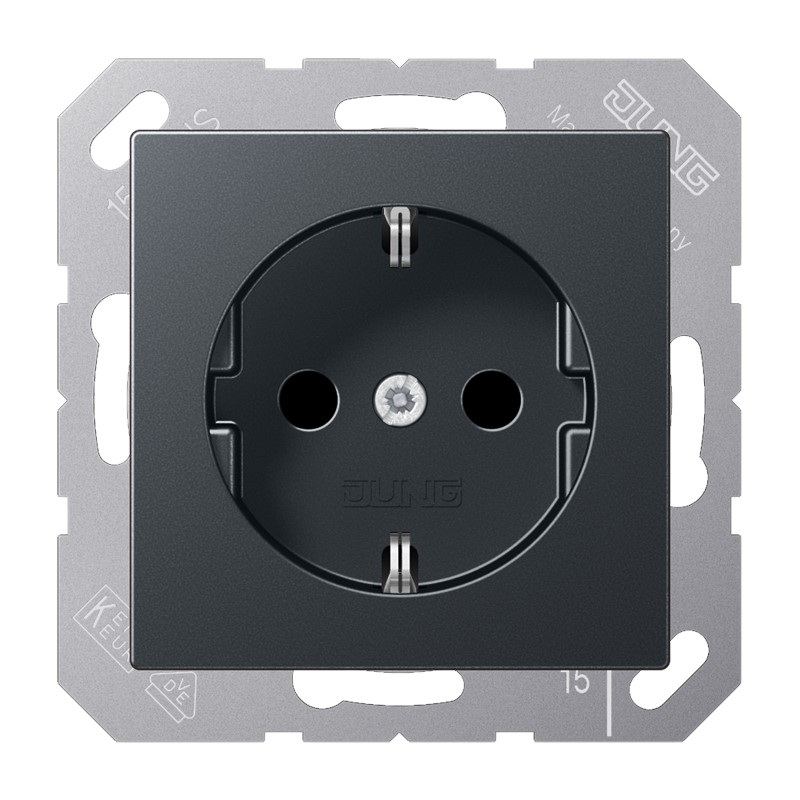 Schutzkontakt®-Steckdose, anthrazit matt mit integriertem erhöhten Berührungsschutz (Safety Plus) mit Federklemmen für starre und unbehandelte flexible Leiter bis 2,5 mm2 Verbindungsklemmen nach DIN VDE 0620 Tragring, Krallen und Krallenschrauben sind über eine Erdungsschiene in die Schutzmaßnahme eingebunden. Material: Thermoplast lackiert Maße (B x H): 55 x 55 mm