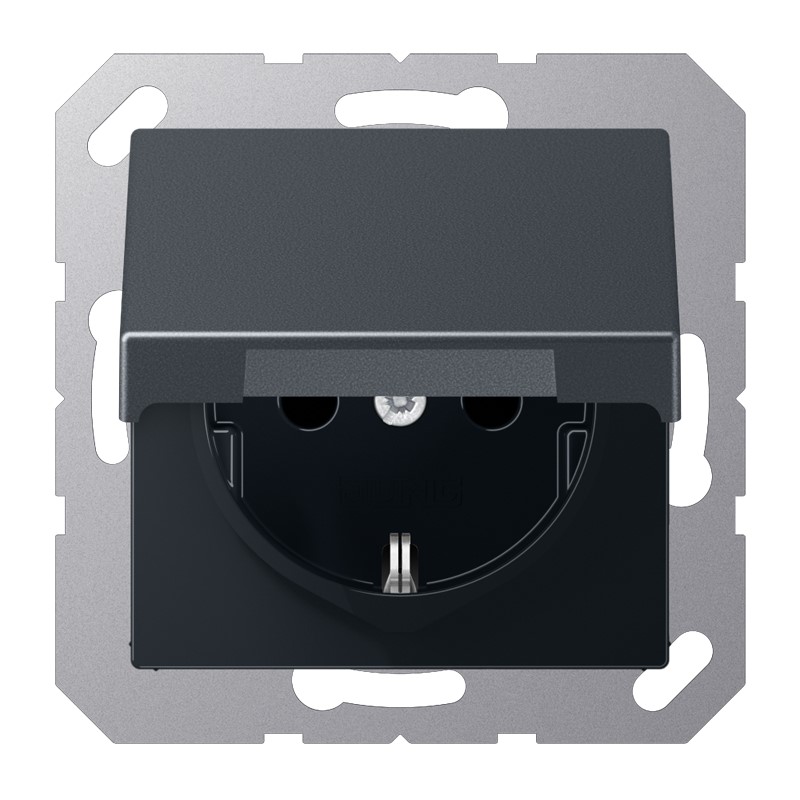 Schutzkontakt®-Steckdose, anthrazit matt mit Klappdeckel (mit Rückstellfeder) mit Federklemmen für starre und unbehandelte flexible Leiter bis 2,5 mm2 Verbindungsklemmen nach DIN VDE 0620 Tragring, Krallen und Krallenschrauben sind über eine Erdungsschiene in die Schutzmaßnahme eingebunden. Material: Thermoplast lackiert Maße (B x H): 55 x 55 mm