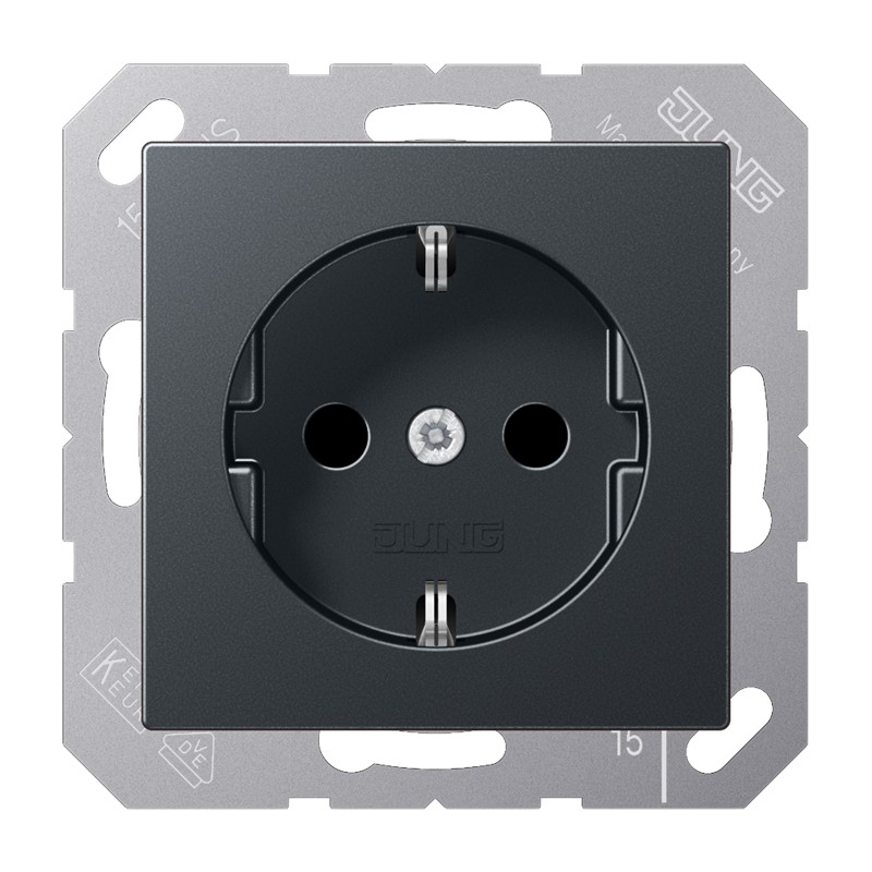 Schutzkontakt®-Steckdose, anthrazit matt mit integriertem erhöhten Berührungsschutz (Safety Plus) mit Federklemmen für starre und unbehandelte flexible Leiter bis 2,5 mm2 Verbindungsklemmen nach DIN VDE 0620 (Schraubbefestigung, ohne Befestigungskrallen) Tragring ist über eine Erdungsschiene in die Schutzmaßnahme eingebunden. Material: Thermoplast lackiert Maße (B x H): 55 x 55 mm