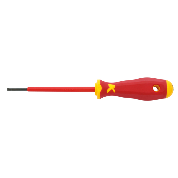 VDE-Schlitz-Schraubendreher, 8,0 x 1,2 mm. Querloch im Griff, ergonomischer 2-Komponenten-Griff für höchste Drehmomente und besten Arbeitskomfort, geeignet für Schlitzschrauben, Griffkopf mit Abrollschutz, schlagfester Hartkern, schwarze Spitze für präzise Passung.