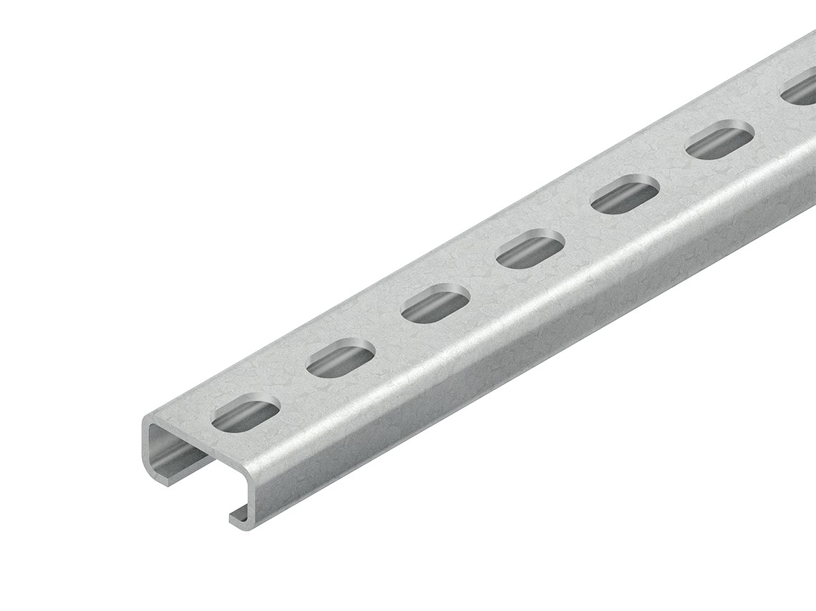 Ankerschiene Modell 2971, C-Profil ähnlich DIN EN 60715, gelocht. Passende Bügelschellen (B... und BK...). In persönlichen Gefährdungsbereichen ist die Schutzkappe SKC 70 anzuordnen. Um ein problemloses Aufsetzen der Schutzkappe zu gewährleisten, ist ein Abstand von mind. 30 mm zum Profilende freizuhalten. Abmessungen (ca. Maße) Höhe H x Breite B x Materialstärke t : 15 x 30 x 2 mm Schlitzweite : 16 mm Profillochung : 9 x 15 mm mittiger Abstand : 25 mm Lieferlänge L : 2000 mm Werkstoff : Stahl, galvanisch verzinkt nach DIN EN ISO 19598, dickschichtpassiviert