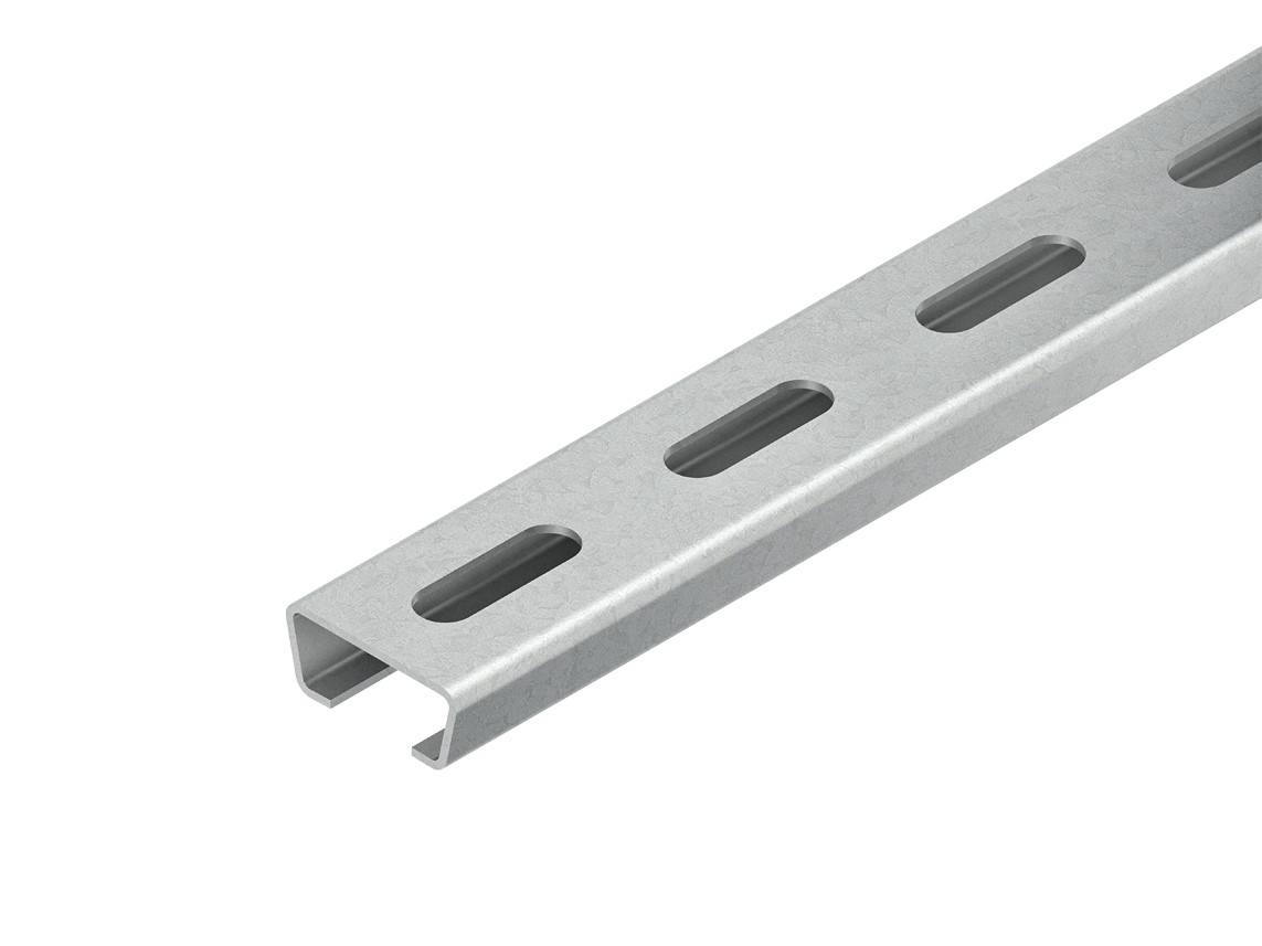 Ankerschiene Modell 2975, C-Profil mit schräg zulaufenden Seiten, gelocht. Passende Bügelschellen (B... und BK...). Abmessungen (ca. Maße) Höhe H x Materialstärke t : 15 x 1,5 mm Breite B auf Breite B1 : 34 auf 29 mm Schlitzweite : 16 mm Profillochung : 9,5 x 30 mm mittiger Abstand : 50 mm Lieferlänge L : 2000 mm Werkstoff : Stahl, tauchfeuerverzinkt nach DIN EN ISO 1461