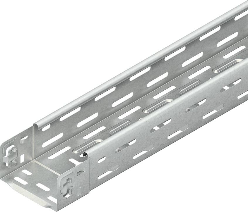 Kabelrinne, leicht, nach DIN EN 61537, mit angeprägtem Stoßstellenverbinder zur schraublosen Schnellbefestigung und mit versetzt angeordneter Boden- und Seitenperforation für stufenlose Befestigung und Anbringung der Systembauteile, Boden zusätzlich gesickt und mit durchgehend mittiger Loch- bzw. Schlüssellochperforation zur Abhängung mit Gewindestäben M 10/... bzw. M 12/... . Zur Verwendung im Funktionserhalt bitte Zusatzvorschriften beachten! Erforderliches Befestigungszubehör für den Funktionserhalt 4x FLM 6X12 bitte gesondert bestellen! VDE zertifiziert! Abmessungen (ca. Maße) H x B : 60 x 100 mm Materialstärke t : 0,75 mm Lochperforation : Ø 11 mm Abstand : 125 mm Schlüssellochperforation : 7 x 38 mm und Ø 12,5 mm Abstand : 125 mm Lieferlänge L : 3000 mm Nutzbarer Querschnitt : 5800 mm² Werkstoff : Stahl, feuerverzinkt nach DIN EN ISO 1461