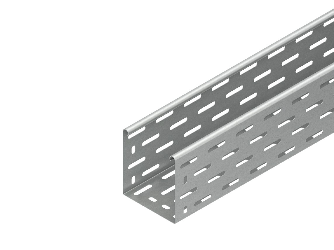 Kabelrinne nach DIN EN 61537, mit versetzt angeordneter Boden- und Seitenperforation, einschließlich einstückigem U-förmigen Stoßstellenverbinder RV 110... und anteilmäßigem Befestigungszubehör. Abmessungen (ca. Maße) H x B : 110 x 100 mm Materialstärke t : 0,9 mm Lieferlänge L : 3000 mm Nutzbarer Querschnitt : 10800 mm² Werkstoff : Stahl, bandverzinkt nach DIN EN 10346