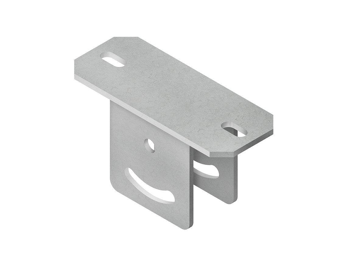 Schraubkopfplatte, vertikal, Kopfplatte mit zwei angeschweißten Anschlussplatten, zur Montage an schrägen Decken mit einem vertikalen Verstellbereich von max. +/- 30°, einschließlich feuerverzinkten anteilmäßigem Befestigungszubehör. Zur Verwendung im Funktionserhalt bitte Zusatzvorschriften beachten! für Profil : U 5050/... Abmessungen (ca. Maße) Kopfplatte L x B x t : 200 x 80 x 6 mm Befestigungslochung : 13 x 28 mm mittiger Abstand : 152 mm Anschlussplattenlochung : Ø 14 mm und 13 mm x 60° mittiger Abstand : 50 mm Gesamtlänge L : 111 mm Werkstoff : Stahl, tauchfeuerverzinkt nach DIN EN ISO 1461