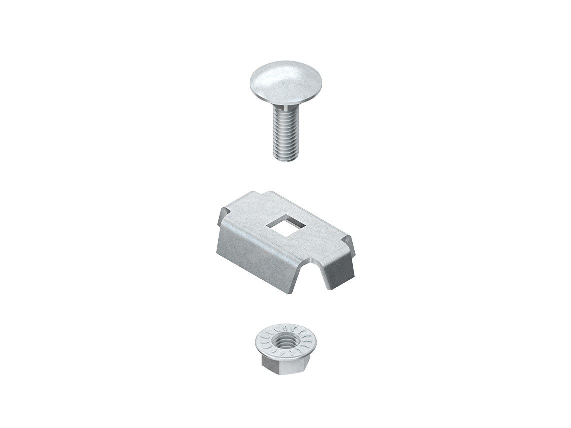 Trennstegbefestigungsklemme, zur Befestigung von Trennstegen auf Gitterrinnen, einschließlich anteilmäßigem tauchfeuerverzinkten Befestigungszubehör. VDE zertifiziert! Zur Verwendung im Funktionserhalt bitte Zusatzvorschriften beachten! Verwendbar für : Gitterrinnen mit einem Draht-Ø 3,9 - 6 mm Werkstoff : Stahl, tauchfeuerverzinkt nach DIN EN ISO 1461