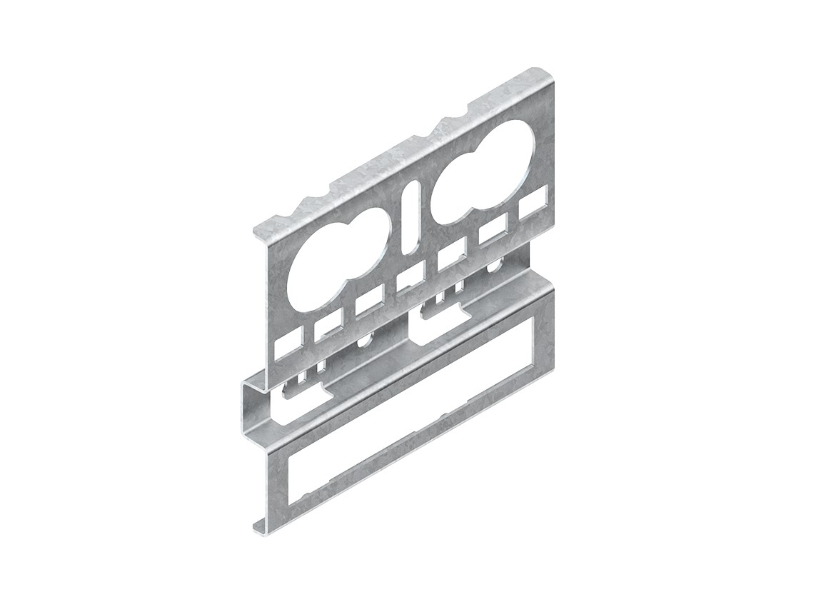 Universalbefestigungsplatte für Gitterrinnen, schaublos, zur Bodenmontage in Gitterrinnen mit mindestens zwei Längsdrähten mit einem mittigen Abstand von 50 mm für Bügelschellenverlegungen B(K)..., Trennsteg- und Kabelbinderbefestigungen, zum seitlichen Anbau an Gitterrinnen mit mindestens zwei seitlichen Längsdrähten mit einem mittigen Abstand von = 25 mm für die Montage von Verteiler- und Abzweigdosen sowie Kabelverschraubungen. Zur Sicherung gegen Aushebeln kann die Lasche mittels einem Schraubendreher umgelegt werden. Verwendung für : Bodenmontage Gitterrinnen MTC..., MTS..., GR..., GRS... und GRC... ab Breite 100 mm Seitenanbau Gitterrinnen MTC 54..., MTC 105..., MTS..., MTCG 50.100, GR 60..., GRS 60... und GRC 60... Abmessungen (ca. Maße) H x B x L : 94 x 10 x 104 mm für Draht-Ø : 3,9 - 6 mm Bodenmontage mittiger Längsdrahtabstand : 50 mm Seitenmontage mittiger Längsdrahtabstand : = 25 mm mittige vertikale Langlochung : 7 x 23 mm Kabelverschraubungslochungen : Ø 20,5 mm und Ø 25,5 mm Kabelbinder-/Verteiler-und Abzweigdosenlochungen : 7 x 10,5 mm Bügelschellenauslass : 16 x 89 mm Werkstoff : Stahl, bandverzinkt nach DIN EN 10346