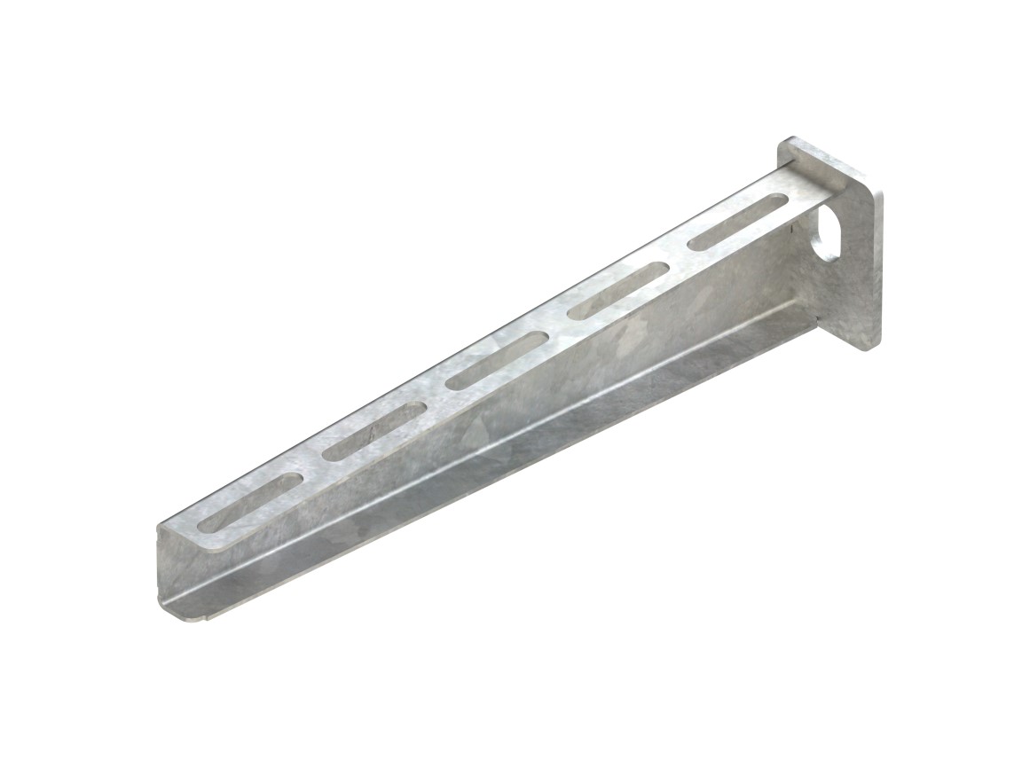 Hängestiel- und Wandausleger, standard, zur Wand- und Hängestielmontage, einschließlich galvanisch verzinkten anteilmäßigem Befestigungszubehör. Die Tragfähigkeitsangaben gelten nur bei ausreichender Verankerung mit dem tragenden Untergrund bzw. bei vorschriftsmäßigen Montagen an Hängestielen. VDE zertifiziert! Abmessungen (ca. Maße) Auflagehöhe H : 55 mm Auflagelänge L : 260 mm Tragfähigkeit F bei L/2 : 2,5 kN im System geprüft Werkstoff Ausleger : Stahl, tauchfeuerverzinkt nach DIN EN ISO 1461