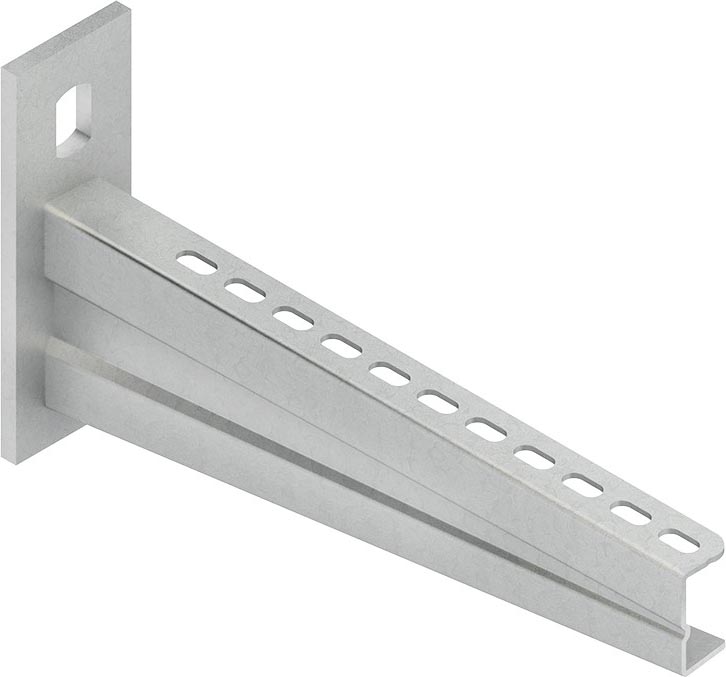 Wandausleger, sehr schwere Ausführung, zur Wandmontage, erforderliches Befestigungszubehör für Kabelrinnen/-leitern sowie Weitspannkabelrinnen/-leitern bitte gesondert bestellen. Die Tragfähigkeitsangaben gelten nur bei ausreichender Verankerung mit dem tragenden Untergrund (min. Beton C20/25) und Verwendung des Dübels DAZ 16X25 im ungerissenen Beton unter Berücksichtigung des Zulassungsbescheides ETA-18/0542. In jedem Fall ist die Einleitung der Lasten ins Bauwerk mit der Bauplanung bzw. Bauleitung abzustimmen. Abmessungen (ca. Maße) Auflagehöhe H : 108 mm Auflagelänge L : 330 mm Tragfähigkeit F bei L/2 : 10 kN im System geprüft, gilt für den Ausleger unabhänging von der Verankerung. Tragfähigkeit F2 bei L/2 : 10 kN im System geprüft, gilt für mittige Lasteinleitung und in Verbindung mit Dübel DAZ 16X25. Bei abweichenden Lasteinleitungen (asymmetrische Lasteinleitung) ist eine Formel zur Errechnung der Tragfähigkeit anzuwenden bitte kontaktieren Sie uns bei Bedarf. Werkstoff Ausleger : Stahl, tauchfeuerverzinkt nach DIN EN ISO 1461