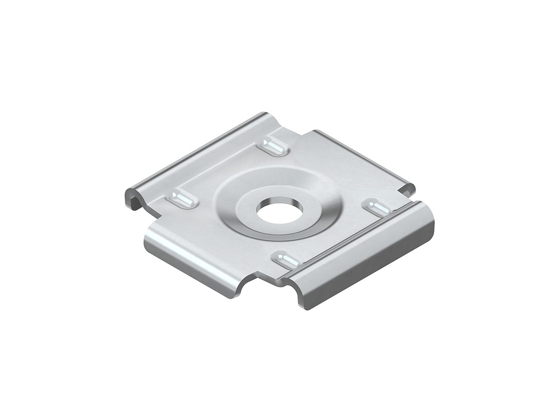 Wand- u. Bodenbefestigungsplatte, zur Wandbefestigung für Gitterrinnen mit einer Breite = 100 mm und mindestens zwei seitlichen Längsdrähten mit einem mittigen Abstand von 50 mm, zur Boden- und Deckenbefestigung für Gitterrinnen mit mindestens zwei Bodenlängsdrähten mit einem mittigen Abstand von 50 mm. Verwendung für Wandbefestigung : MTC 105.100 MTS 105.100 MTCG 50.100 Verwendung für Bodenbefestigung : alle Niedax Gitterrinnen, MTC... .100 - ... und MTS... .100 - ..., mit Ausnahme von GR 40.040, GRC 60.060 und GRCI 50.050 - ... .300 Verwendung für Deckenbefestigung : MTCG 50.100 Abmessungen (ca. Maße) B x L x H : 59 x 60 x 8 mm Befestigungslochung : Ø 11 mm für Drahtabstand : 50 mm Werkstoff : Stahl, bandverzinkt nach DIN EN 10346