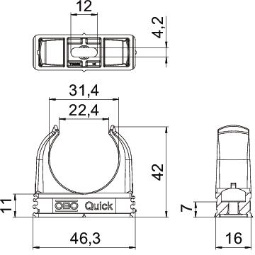 Aufputzschelle zur Aufnahme von metrischen Stahlpanzerrohren, leichten und schweren Isolierrohren sowie Elektroinstallationsrohr Quick-Pipe. Universelle Befestigungsmöglichkeiten an Wand und Decke im Innen- und geschützten Außenbereich. Mit Langloch zum seitlichen Ausrichten bei Montage mit Holzschraube oder Schlagdübel. Werkzeuglose Rohrmontage. Aneinander reihbar auch mit OBO Multi-Quick- oder proQuick-Schelle. Größe M16 - M32 kann auf Gewinde M6 geschraubt werden. Befestigungsabstand 50 - 60 cm, max. Auszugswerte F bei 20° C Raumtemperatur siehe Tabelle.