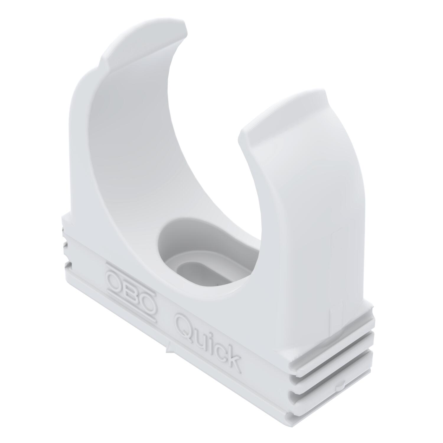 Flammwidrige Aufputzschelle zur Aufnahme von metrischen Stahlpanzerrohren, leichten und schweren Isolierrohren sowie Elektroinstallationsrohr Quick-Pipe. Universelle Befestigungsmöglichkeiten an Wand und Decke im Innen- und geschützten Außenbereich. Mit Langloch zum seitlichen Ausrichten bei Montage mit Holzschraube oder Schlagdübel. Werkzeuglose Rohrmontage. Aneinander reihbar auch mit OBO Multi-Quick- oder proQuick-Schelle. Größe M16 - M32 kann auf Gewinde M6 geschraubt werden. Befestigungsabstand 50 - 60 cm, max. Auszugswerte F bei 20° C Raumtemperatur siehe Tabelle.