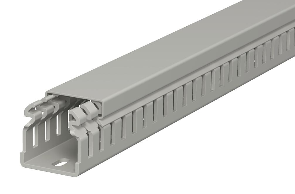 Verdrahtungskanal nach DIN EN 50085-2-3 inkl. Oberteil und Bodenlochung zur waagerechten und senkrechten Verlegung elektrischer Kabel und Leitungen im Schaltschrank. Ausführung als DIN-Kanal. Das Ausbrechen der Stege erfolgt werkzeuglos. Bodenbündiges Ausführen ist durch Sollbruchstellen möglich. Geprüft nach DIN EN 50085-2-3. Sonderlängen auf Anfrage.