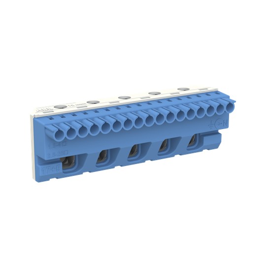 N Quick-Steckklemme für Quick-Steckträger, werkzeuglose Montage durch einfache Steck- und Rasttechnik, klare Farbcodierung: N = blau, flexibles Klemmensystem für mehrere N-Stromkreise, Anzahl der Klemmen: 17 x 1,5 - 4 mm² (Federklemmtechnik) + 5 x 2,5 bis 25 mm² (Schraubanschlusstechnik), Außenmaße H x B x T in mm: 32 x 98 x 31, einfaches Beschriften der Klemmenstellen (DIN VDE 0603 Teil 1) mit vorgedruckten, selbstklebenden Zahlenstreifen.