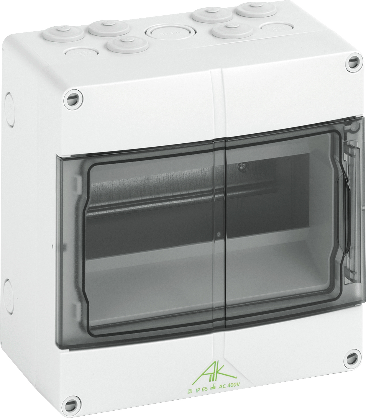 Kleinverteiler, mit Schutzart IP65, 1-reihig, 9 verfügbare Teilungseinheiten, Bemessungsbetriebsspannung: 400V AC, Bemessungsisolationsspannung: 1000V AC, 1000V DC, oben und unten metrische Vorprägungen für universelle Leitungseinführungen mit Kabelverschraubungen und / oder Doppelmembranstutzen, oben mit elastischen Einführungen DMS M20 vorbestückt, für die Standardinstallation im Innenbereich, mit PE/N-Klemmschiene mit jeweils 2 Klemmstellen 16mm² und 5 Klemmstellen 6mm²Abmessungen: 200 x 200 x 122mmBeigefügtes Zubehör: Doppelmembranstutzen: 1x M20, 1x M32, Verschlussstopfen, Abdeck- und Beschriftungsstreifen