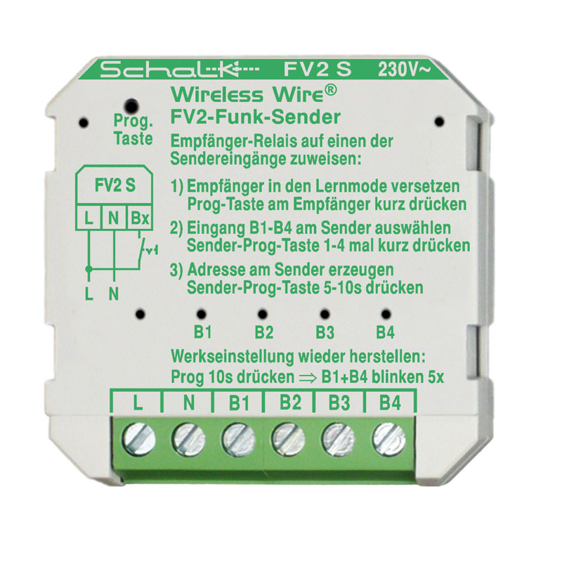 Der Funk-Verbinder-Sender FV2 S verfügt über 4 Eingänge, an welchen externe Kontakte angeschlossen werden können. Jede Änderung an den Eingängen des Senders wird via Funk auf den Relaiskontakt eines oder mehrerer FV2-Empfänger übertragen., Maße: 43x43x18,5mm, 230V AC - 4 Eingänge