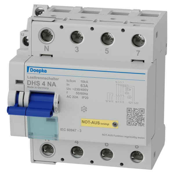 Lastrenn- bzw. Hauptschalter trennen elektrische Verbraucher oder Anlagenteile vollständig und allpolig von der elektrischen Versorgung. Sie schalten auch unter Last oder Überlast. Sie werden zur Abschaltung für Wartungsarbeiten und zum Anlagenschutz eingesetzt. Die Geräte der Baureihe DHS 4 sind Lasttrenn- bzw. Hauptschalter in vierpoliger Ausführung bei denen der N-Kontakt voreilend eingeschaltet und nacheilend ausgeschaltet wird. Durch ihre Bauart fügen sie sich hervorragend in die Optik der Fehlerstromschutzschalter DFS ein. DHS mit NOT-AUS-Funktion ermöglichen den Anschluss einer NOT-AUS-Einrichtung, wie z. B. Taster. Eine integrierte LED signalisiert die Auslösung durch ein Betätigungselement oder durch Drahtbruch. Eine Wiedereinschaltung wird bis zur Behebung verhindert.- Hersteller-Artikelnummer (MPN)