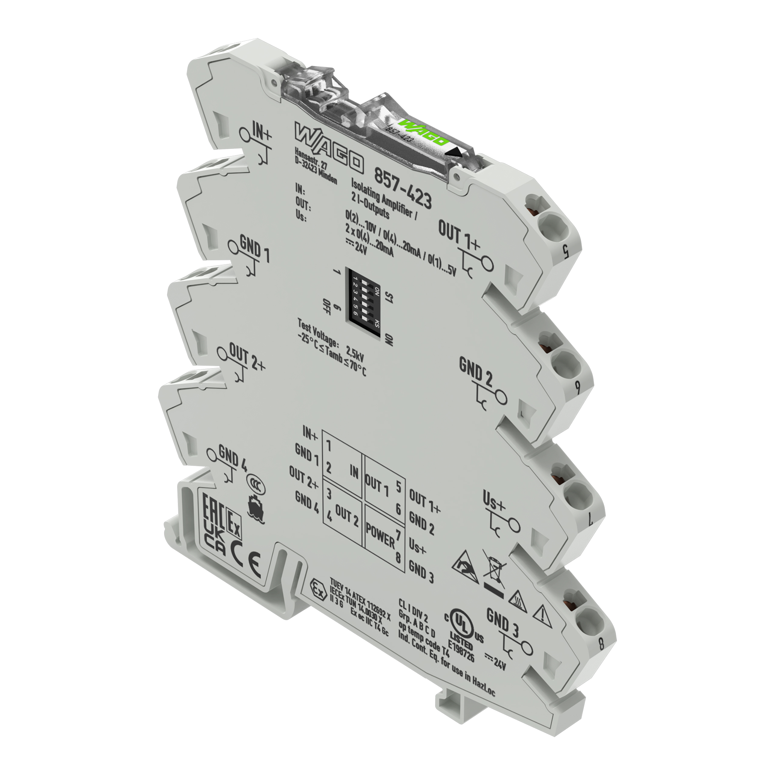 Trennverstärker Strom- und Spannungseingangssignal 2 x Stromausgangssignal Versorgungsspannung DC 24 V 6 mm Baubreite 2,50 mm²Kurzbeschreibung: Der Signalverdoppler wandelt analoge Normsignale, verstärkt, filtert und trennt die analogen Normsignale galvanisch voneinander. Merkmale: 2 konfigurierbare Stromausgänge. Kalibrierte Messbereichsumschaltung. Umschaltbare Grenzfrequenz.