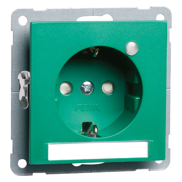 Steckdose SCHUKO mit Kontroll-Licht LED, mit grünem Sockel 2-polig, 16 A 250 V, mit Steckklemmen, mit grüner LED als Spannungsanzeige, 230 V/1mA, LED-Lebensdauer ca. 10 Jahre, mit grüner Zentralplatte für Kombinationen, mit Beschriftungsfeld 7 x 44 mm