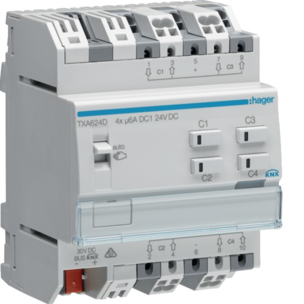 Der Rollladen-/Jalousieaktor 4-fach KNX easy, 24V ist ein Reiheneinbaugerät für die Steuerung von DC-Antrieben bei Jalousien, Rollläden oder Markisen. Ausgestattet mit QuickConnect Steckklemmen und integriertem Busankoppler ermöglicht er eine einfache KNX-Integration. Funktionen umfassen Auf-/Ab-Betrieb, Lamellenwinkelverstellung, Positionierung und Prozent-Parametrierung. Programmierbar via ETS ab Version 4, unterstützt das Gerät Automatikfunktionen und bis zu 64 Szenen pro Kanal.