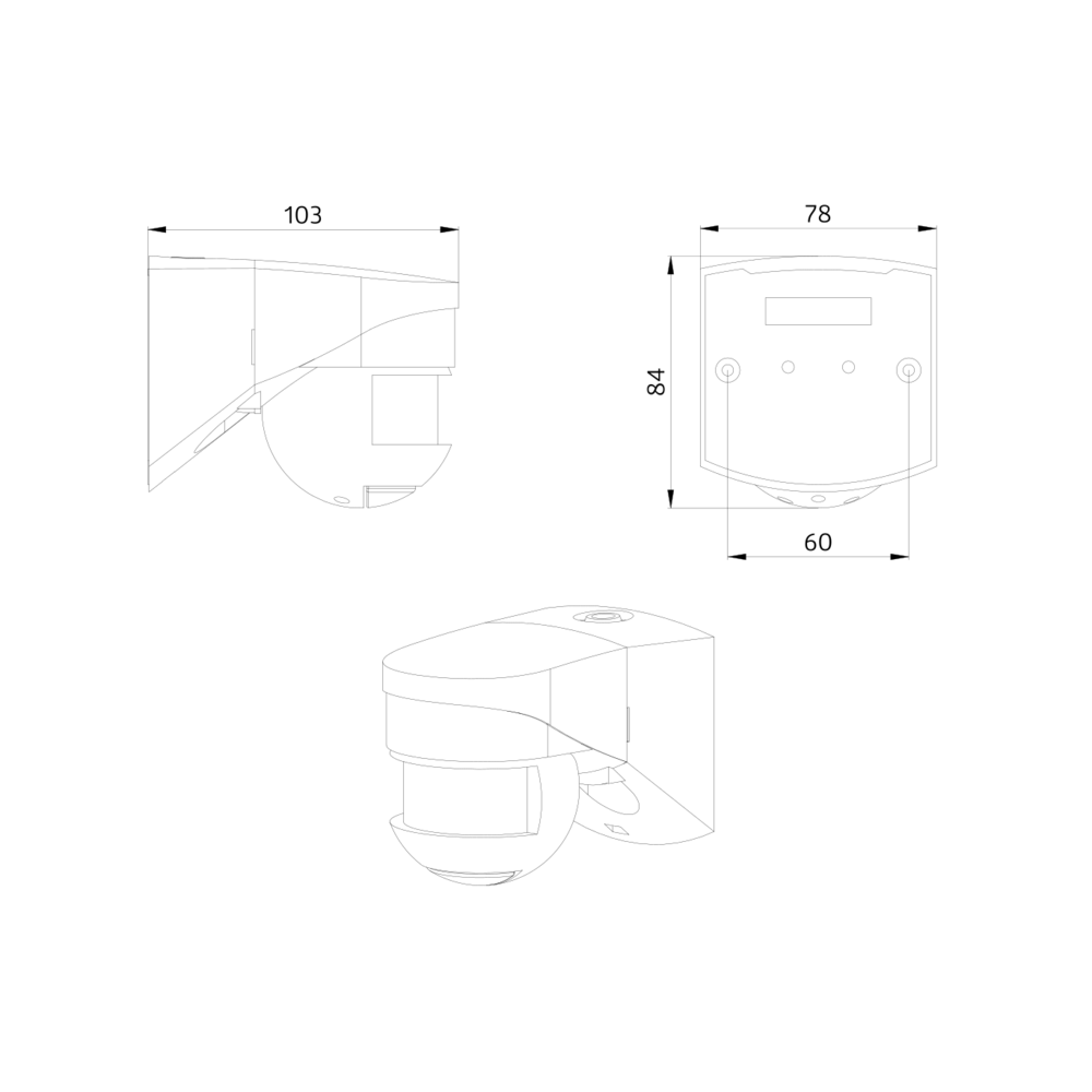 Bewegungsmelder mit 140 Grad Erfassungsbereich und 180 Grad Unterkriechschutz, Beweglicher Kugelkopf, Erfassungsbereich kann durch Abdecklamellen eingeschränkt werden, Schaltung im Nulldurchgang, Einfache Montage durch Stecksockel, Leitungseinführung von oben, von unten und von hinten möglich, Montage auf Standard UP-Dosen möglich