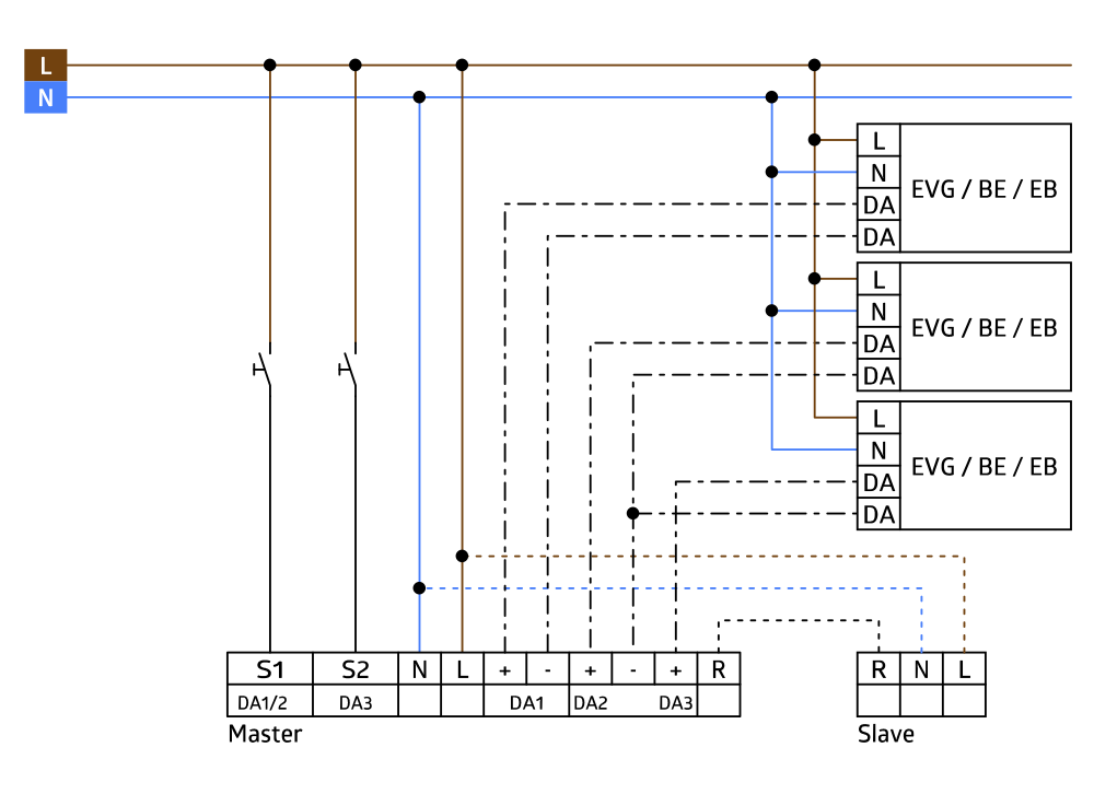 Präsenzmelder für zwei Lichtgruppen zur tageslichtabhängigen Beleuchtungsregelung und einer dritten Lichtgruppe zur Lichtschaltung, Ansteuerung von bis zu 25 digitalen Dimm-EVG und Steuermodulen als Gruppe je DALI-Schnittstelle 1 und 2 und bis zu 10 bei DALI-Schnittstelle 3, Zwei unabhängige, bewegliche Lichtfühler, Ein gemeinsamer Erfassungsbereich, Umschalten zwischen DALI und DSI mittels Fernbedienung möglich, Ausführung als Master-Gerät, Erweiterung des Erfassungsbereiches mit Slave-Geräten möglich, Manuelles Schalten und Dimmen über Taster möglich, Weitere Funktionen über optionale Fernbedienung einstellbar, Orientierungslichtfunktion, Halbautomatik-, Vollautomatik- oder Dämmerungsschalterbetrieb