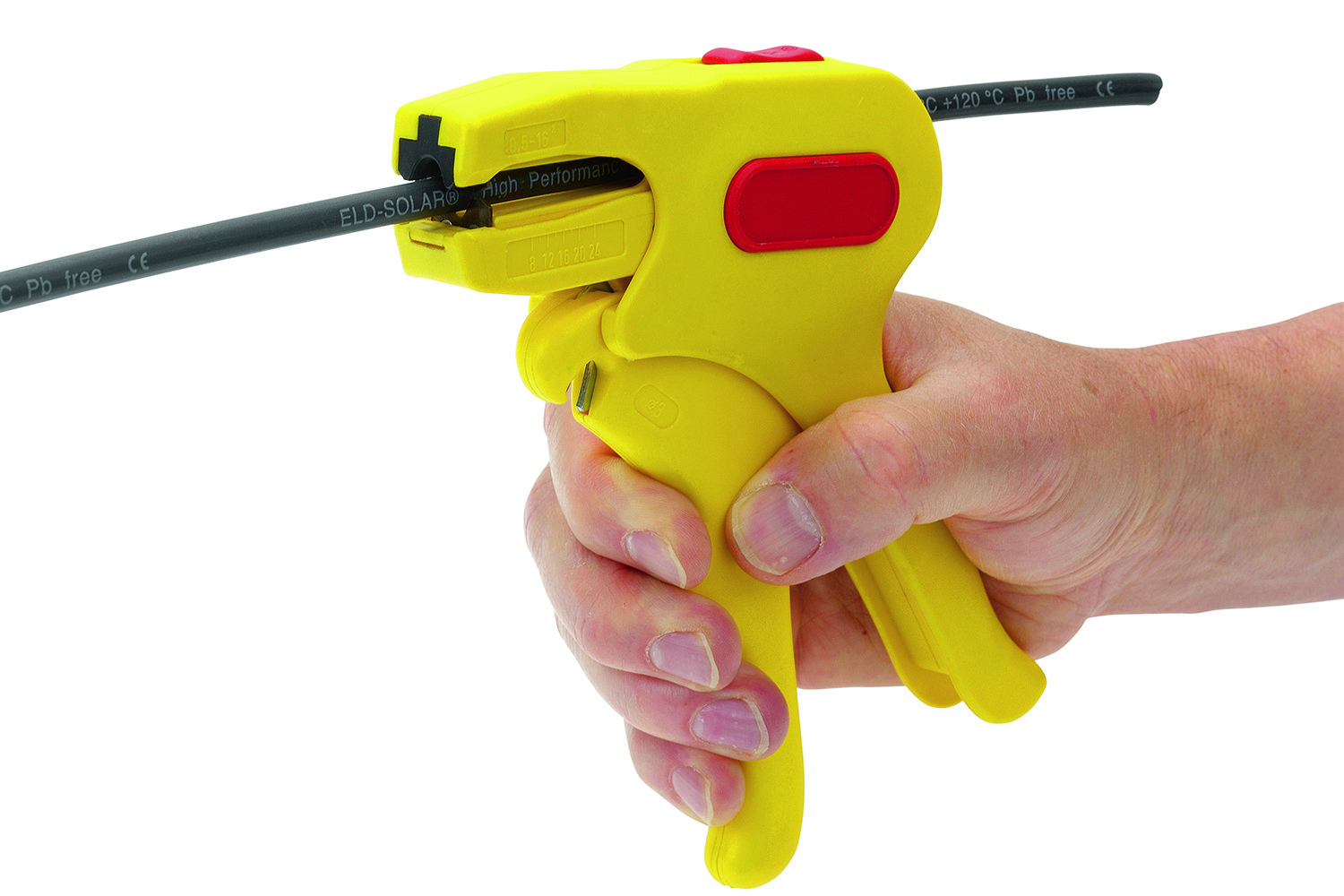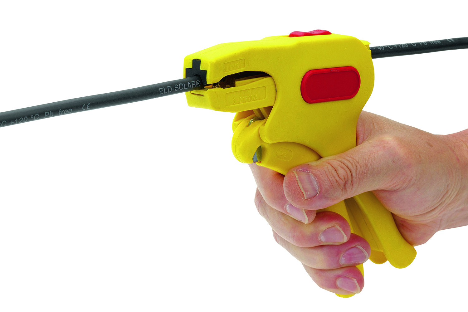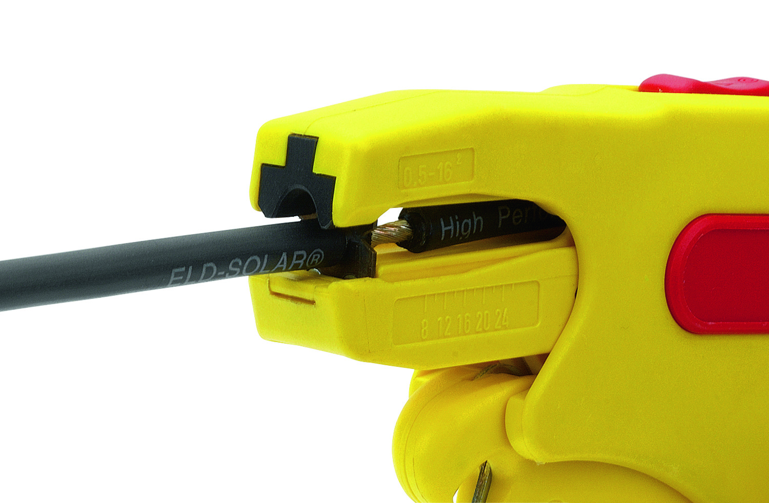 Automatische Abisolierzange für alle gängigen Solarkabel von 1,5 mm² bis 10 mm², die in dem Bereich Photovoltaik eingesetzt werden. Durch die präzise 5-fach verstellbare Feineinstellung ist auch das Entfernen von mehrlagigen Isolierungen bei Solarkabeln ohne Probleme möglich. Optisches Längenmaß von 8 bis 24 mm, 5/16 bis 1 für stets gleiche Abisolierlängen. Mit integriertem, gut zugänglichem Seitenschneider für Kabel bis maximal 3 mm Ø. Ergonomischer Pistolengriff für ermüdungsfreies Arbeiten. Gewicht nur 240 g.