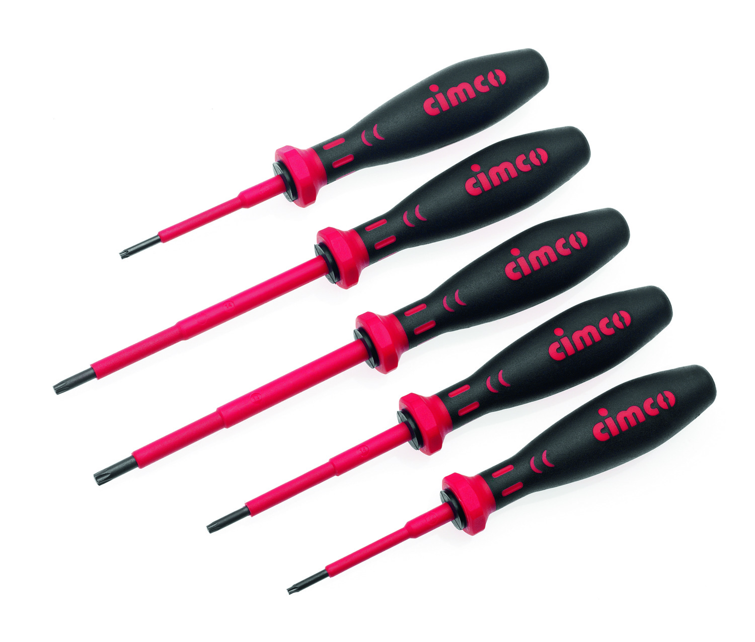 Isolierte VDE-Schraubendreher nach IEC 60900. Klassifikation VDE 0682, Teil 201. Stückgeprüft im Wasserbad mit einer Prüfspannung von 10.000 Volt. VDE-TX-Schraubendreher; Maße:, T 8x60 mm (CIMCO-Artikelnr. 11 7908), T10x60 mm (CIMCO-Artikelnr.11 7910), T 15x75 mm (CIMCO-Artikelnr.11 7915), T 20x100 mm(CIMCO-Artikelnr.11 7920), T25x100 mm(CIMCO-Artikelnr.11 7925)