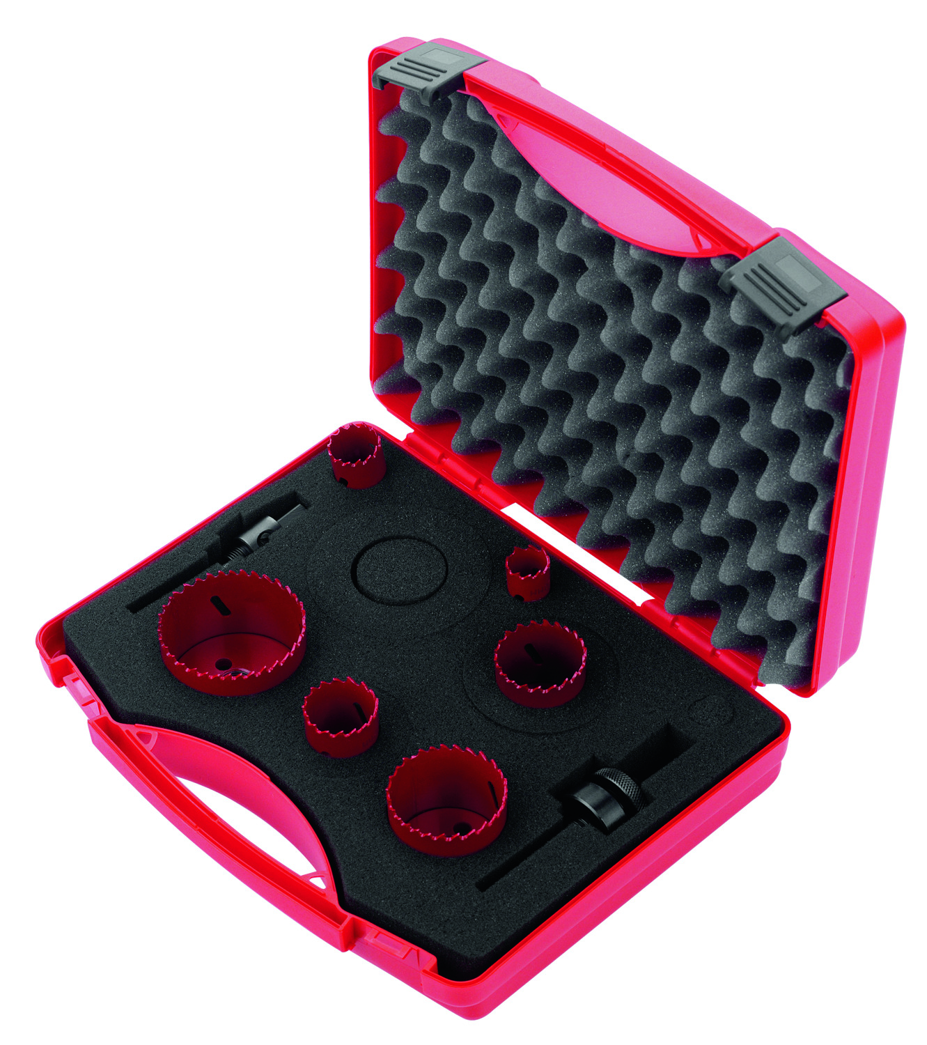 ELEKTRO METRISCH mit 6 Lochsägen zum Bohren von Durchgangslöchern für metrische Kabelverschraubungen. Aufnahmeschäfte mit HSS-Führungsbohrer, (CIMCO-Artikelnr. 20 7580 und 20 7584) bestehend aus: mit einem Ø von 20 mm (20 7420), mit einem Ø von 25 mm (20 7425), mit einem Ø von 32 mm (207432), mit einem Ø von 40 mm (207440), mit einem Ø von 50 mm (207450), mit einem Ø von 64 mm(207464)