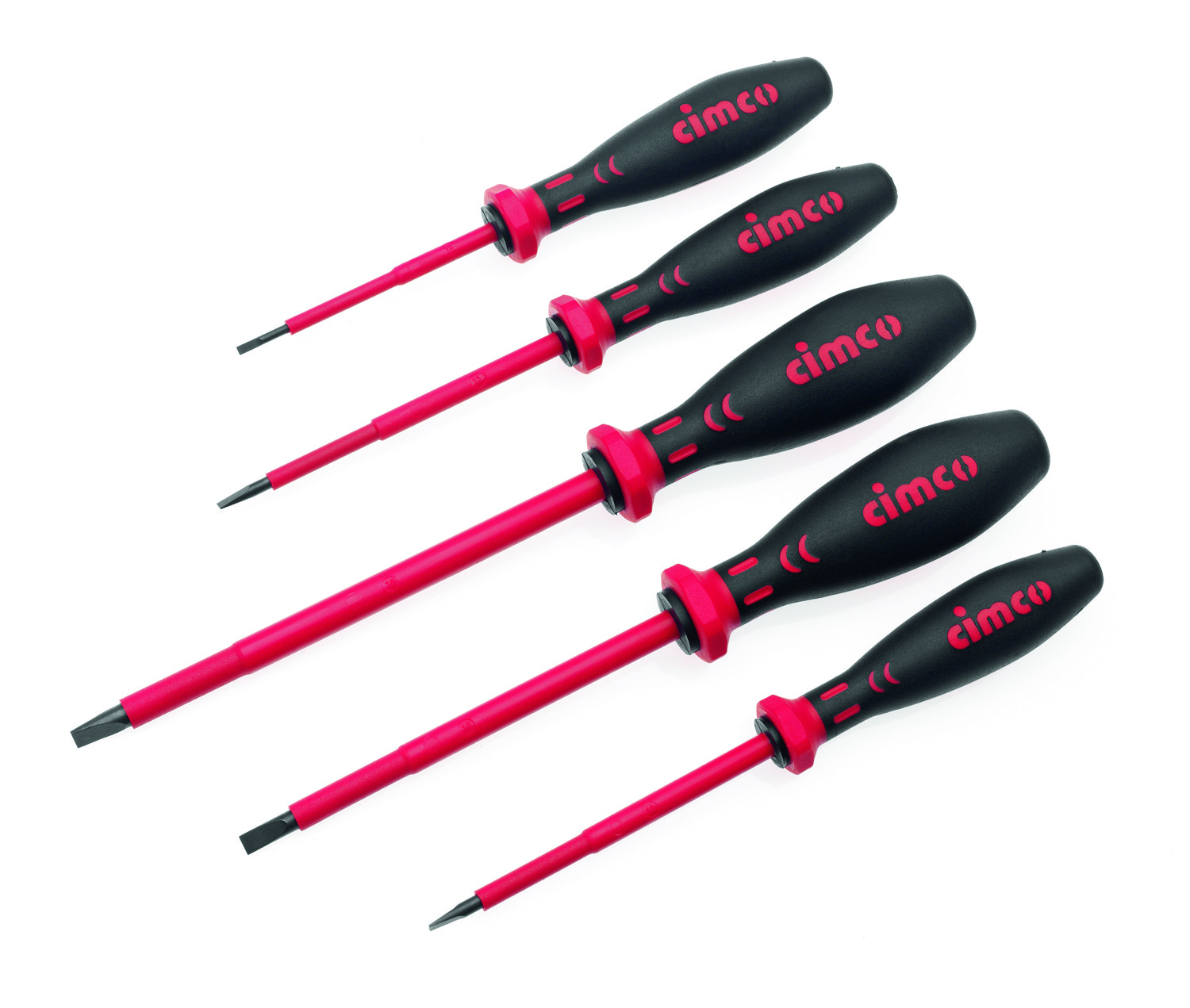 1.000 V VDE Schlitz-Schraubendreher-Sortiment, 5-teilig, VDE-Schraubendreher für Schlitzschrauben:, 2,5x0,4x75 mm (Art-Nr. 117701), 3,5 x 0,6 x100 mm (Art-Nr. 117703), 4,0x0,8x100 (Art-Nr. 117704), 5,5x1,0x125 (Art-Nr. 117705), 6,5x1,2x150 mm (Art-Nr. 117706)