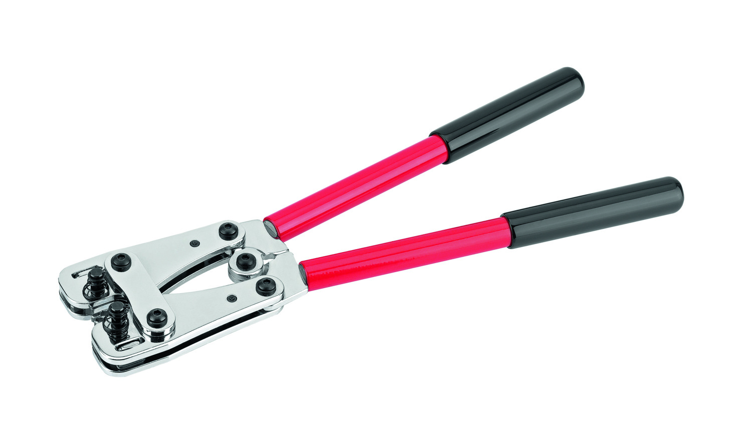 Presszange mit drehbaren Profilscheiben, hebelübersetzt, für Rohrkabelschuhe und Verbinder. WM-Pressprofil für Querschnitte 6 - 50 mm². Freigabe für Leiterklasse 2, 5 und 6 nach IEC 60228