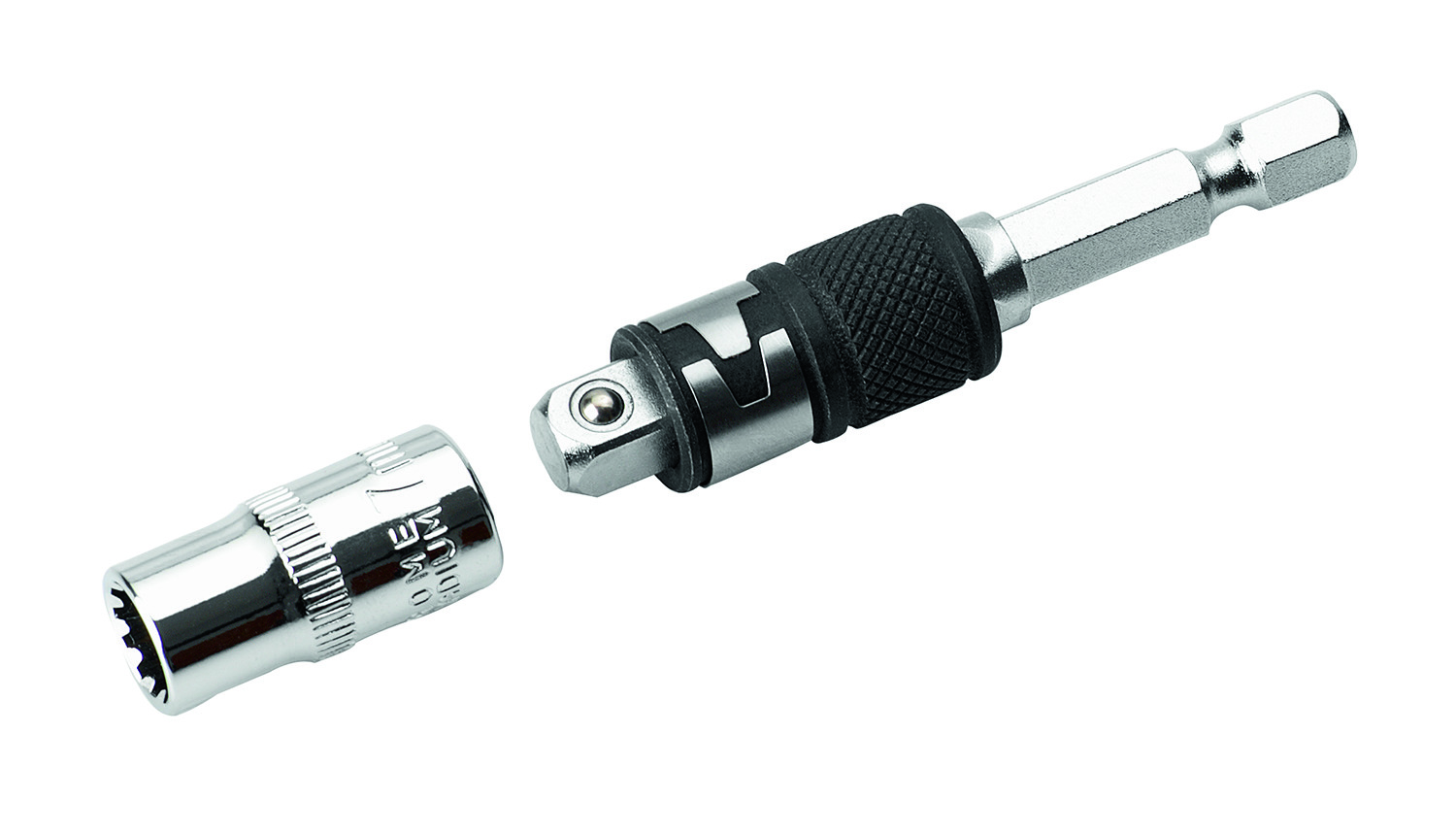 Steckschlüssel-Bit-Halter. Durch einfaches Verschieben der Hülse als Steckschlüsseladapter sowie Bithalter verwendbar. Das Verschieben ist auch bei Fixierung im Backenfutter des Akkuschrauber möglich. Werkzeugaufnahme je 1/4''-Außensechskant und -Innenvierkant. Maße: LxBxT: 70x13x13 mm