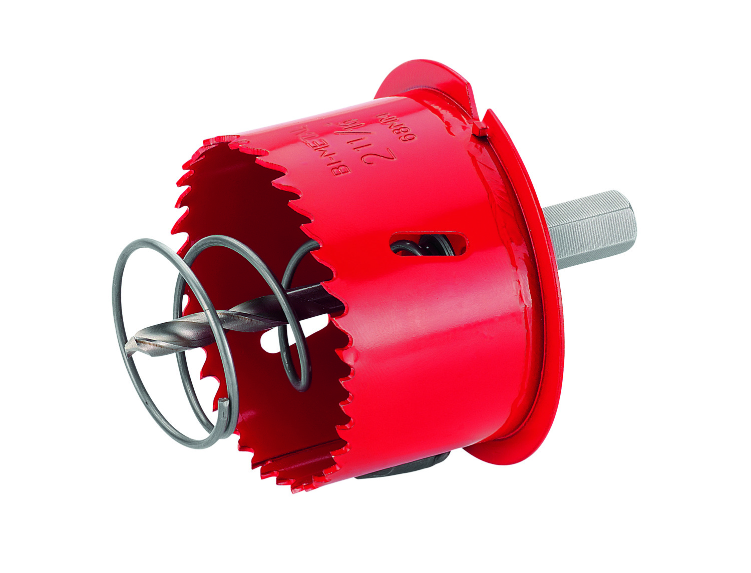 Lochsäge mit einem Ø von 68 mm; mit integriertem Randversenker, Sechskantaufnahme und Ausdruckfeder: HSS-Bi-Metall mit Vario-Zahnung, 11 mm Sechskantaufnahme ohne Mitnehmer, Zentrierbohrer 105 mm, Ø- 6 mm, Ausdruckfeder. Ausführung: für Holz und Rigips: Größe: 68 mm