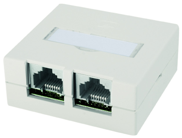Leistungsmerkmale: Geeignet für 10 Gigabit Ethernet gemäß IEEE 802.3an, Übertragungstechnische Eigenschaften: PL Class EA (ISO/IEC) 500 nach ISO/IEC 11801 EN 50173-1, Aufputzgehäuse mit klapp- und unverlierbarem, transparentem Beschriftungsfeld, Anschluss der Installationskabel mit LSA-Plus-Schneidklemmen mit farbiger Kennzeichnung gemäß EIA/TIA 568A und B, Schirmkontaktierung und Kabelzugentlastung über Schraubklemme für beide Kabel gemeinsam, Kompakte Bauform für Aufputzmontage mit zwei RJ45-Ausgängen parallel zur Montageebene, Geschirmte Ausführung, RJ45-Auslass nach unten, Kabelzuführung von oben, Befestigung mit 2 Schrauben max. 3,5 mm Durchmesser, Kunststoffgehäuse mit aufgeschnapptem Deckel