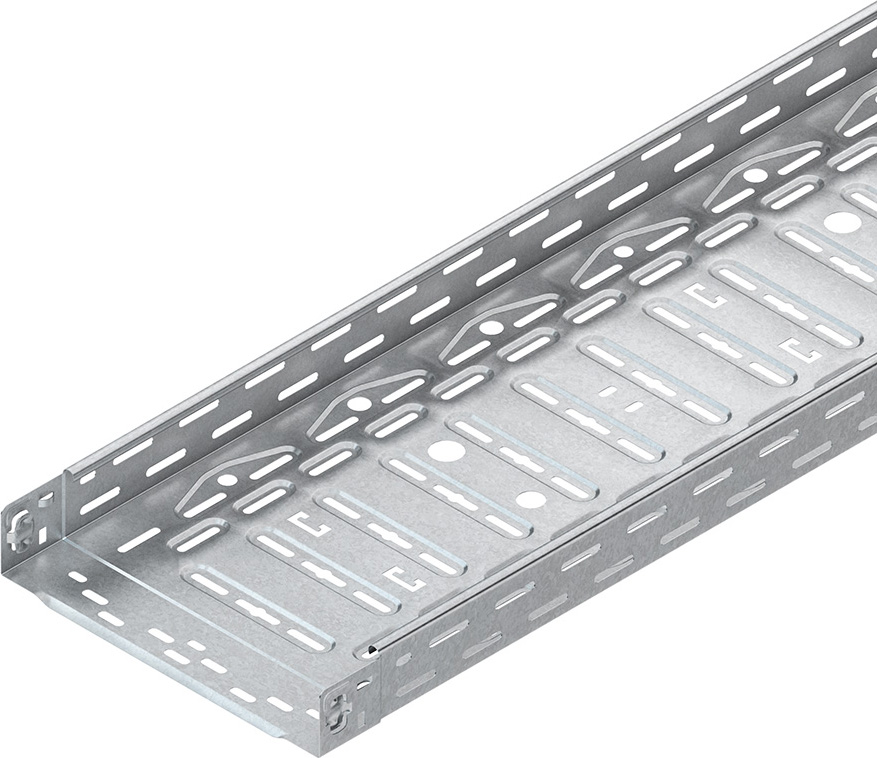 Kabelrinne, leicht, nach DIN EN 61537, mit angeprägtem Stoßstellenverbinder zur schraublosen Schnellbefestigung und mit versetzt angeordneter Boden- und Seitenperforation für stufenlose Befestigung und Anbringung der Systembauteile, Boden zusätzlich gesickt und mit durchgehend mittiger Schlüssellochperforation zur Abhängung mit Gewindestäben M 10/... versehen, zusätzlich ermöglicht eine 4-reihige aus der Mitte durchgehend symmetrisch angeordnete Bodenlochung die Aufnahme von Kabelverschraubungen, zwei ebenfalls symmetrisch im Boden eingebrachte Reihen von T-Auslässen ermöglichen eine Schnellbefestigung der Kabelbinder durch einschlaufen von oben (kein Fädelaufwand). Zur Verwendung im Funktionserhalt bitte Zusatzvorschriften beachten! Erforderliches Befestigungszubehör für den Funktionserhalt 4x FLM 6X12 bitte gesondert bestellen! VDE zertifiziert! Abmessungen (ca. Maße) H x B : 60 x 300 mm Materialstärke t : 0,75 mm Schlüssellochperforation : 7 x 40 mm und Ø 11 mm Abstand : 62,5 mm innere symmetrische Bodenlochreihe : Ø 20,5 mm und Ø 25,5 mm symmetrischer Abstand : 80 mm Abstand : 375 mm äußere symmetrische Bodenlochreihe : Ø 13,5 mm und Ø 16,5 mm symmetrischer Abstand : 245 mm Abstand : 125 mm T-Auslässe : 14 x 30 mm symmetrischer Abstand : 90 mm Abstand : 375 mm Lieferlänge L : 3000 mm Nutzbarer Querschnitt : 17800 mm² Werkstoff : Stahl, bandverzinkt nach DIN EN 10346