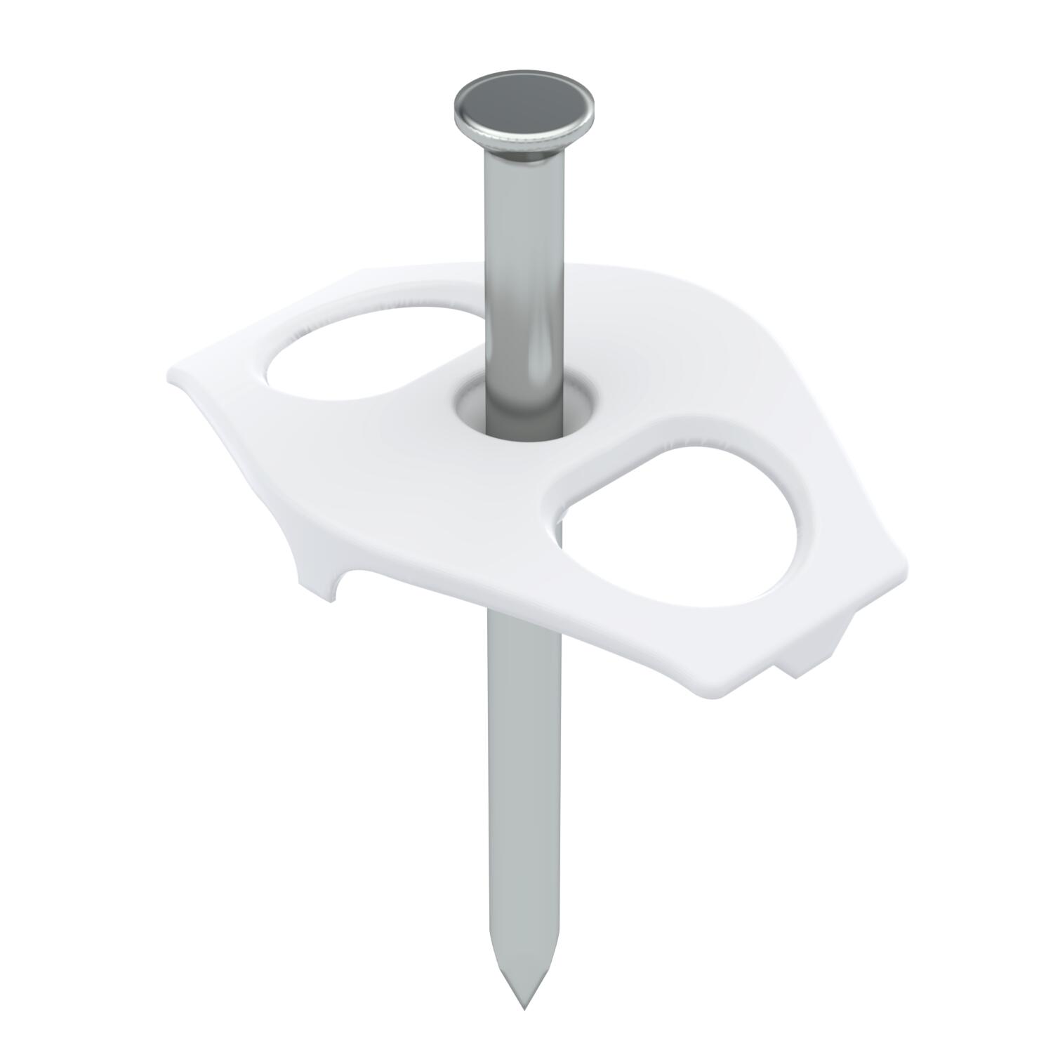 Mit vormontiertem, verzinkten Stahlnagel Ø 3 mm oder 3,5 mm zur Fixierung von Leitungen in Mauerschlitzen und auf Mauerwerk für 1 bzw. 2 Leitungen NYM 3 x 1,5/2,5 mm² oder 1 bzw. 2 Leitungen NYM 5 x 1,5/2,5 mm².