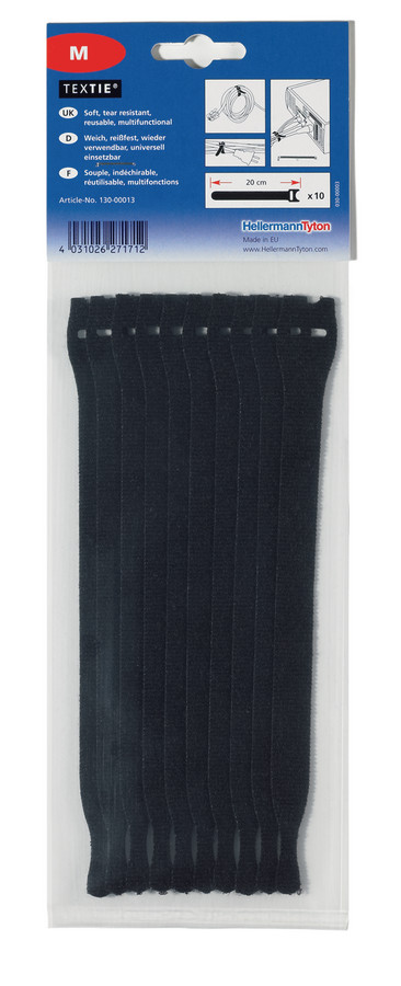 Schnelle und einfache Verarbeitung per Hand. Wiederverwendbar bis zu 400 mal. Verschiedene Farben zur Kennzeichnung erhältlich. Für den Innen- und Außenbereich. Kann dauerhaft an das Bündel angeschlossen werden. Beständig gegen Alterung, keine Korrosion. TEXTIE Klettkabelbinder sind eine sanfte Bündelungsmethode und ideal geeignet, um empfindliche Kabel wie zum Beispiel Telefonkabel, Glasfaser- und Netzwerkkabel zu bündeln. Die TEXTIE Kabelbinder können bis zu 400 mal wieder geöffnet und verschlossen werden. Eine perfekte Lösung für temporäre Installationen und das Kabelmanagement innerhalb der Bühnentechnik, bei Outdoor Events oder für die Prototypenfertigung. Darüber hinaus finden sich zahlreiche Anwendungen für den Büro- und Privatbereich. TEXTIE Kabelbinder sind in verschiedenen Farben erhältlich und können neben der Bündelung auch zur Kennzeichnungen verwendet werden.- Hersteller-Artikelnummer (MPN)