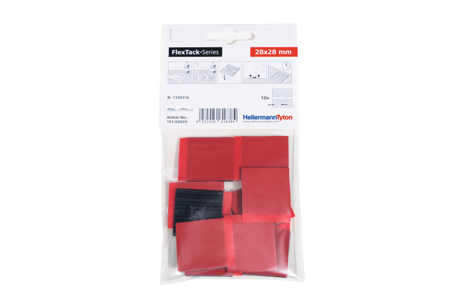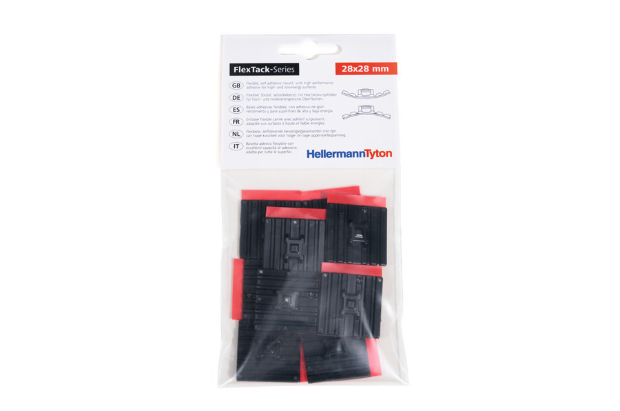 Flexibler Sockel für abgerundete und gewinkelte Oberflächen. FMBAPT Sockel werden mit einem 100 % geschlossenzelligem Acrylatklebeband geliefert. Größere Designfreiheit, Gewichtsreduzierung und Prozesskostenoptimierung. Kleber mit hoher Zug- und Scherfestigkeit. Innovative Befestigungslösung für niederenergetische Oberflächen. Schutzfolie mit Überstand für sehr einfaches Abziehen. Temperaturbeständig bis zu +105 °C. Kabelbinder kann von vier Seiten eingeschlauft werden. Schnelle, einfache und flexible Montage. FMB4APT-I kann auch für hochenergetische Oberflächen wie Metall oder Glas verwendet werden. FlexTack Sockel sind eine innovative Befestigungslösung insbesondere für gebogene und abgewinkelte Oberflächen. Der verwendete Acrylat-Klebstoff ist für hoch- und niederenergetische Oberflächen geeignet. Die flexiblen Klebesockel bieten eine Alternative überall dort, wo Schraubbefestigungen nicht möglich sind und können, bedingt durch die Produkteigenschaften, für eine Vielzahl von Anwendungen eingesetzt werden. Dazu gehören unter anderem pulverlackbeschichtete oder lackierte Oberflächen, Metalloberflächen sowie Kunststoffverkleidungen in diversen Bereichen wie Schaltschränken, Schienenfahrzeug-, Flugzeug-, Fahrzeug- und Landmaschinenbau.