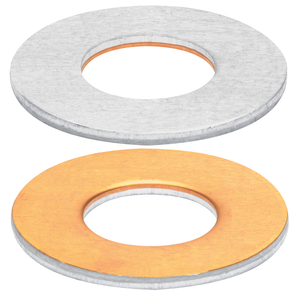 Unterlegscheibe bei der Verarbeitung von Aluminium- und Kupferkabelschuhen. Galvanische Trennung zwischen Kupfer und Aluminium. Verarbeitung nur in trockener Umgebung. Werkstoff E-Al, einseitig mit Cu plattiert. M12