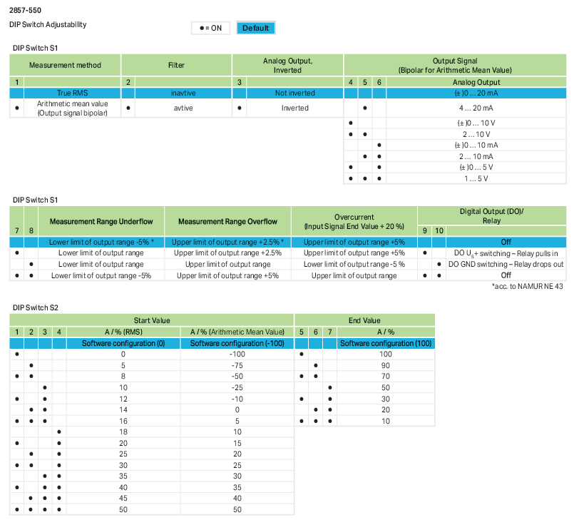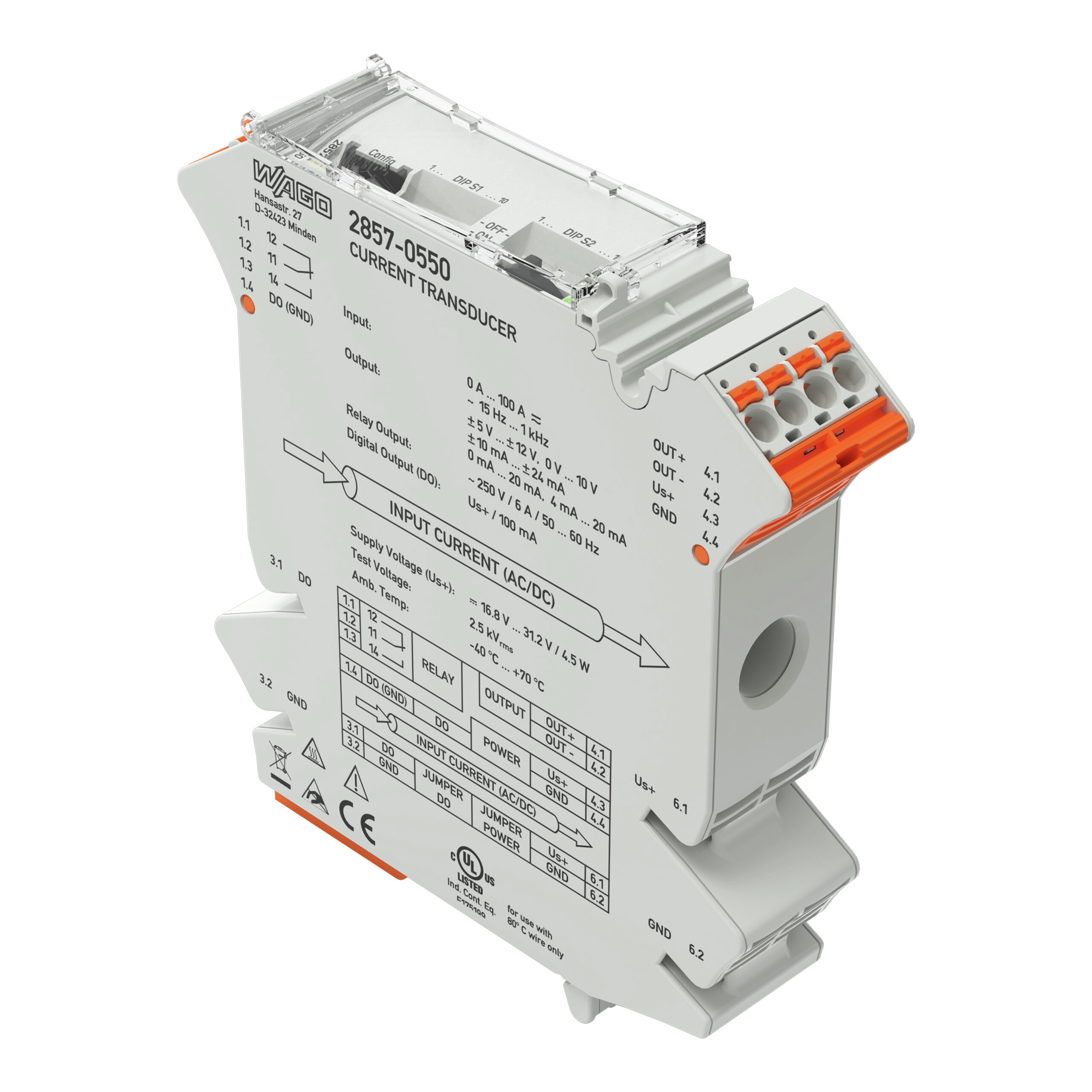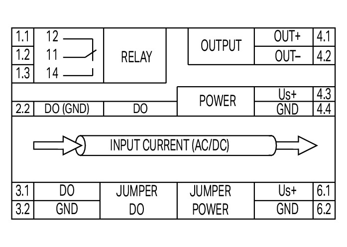 Strommessumformer; Stromeingangssignal; Strom- und Spannungsausgangssignal; Digital- und Relaisausgang; Konfiguration per Software; Versorgungsspannung DC 24 V; 22,5 mm BaubreiteKurzbeschreibung: Der Strommessumformer dient zum Erfassen von Gleich- und Wechselströmen im Messbereich bis AC/DC 100 A. Ausgangsseitig wandelt er die Messgröße in ein analoges Normsignal um. Merkmale: Ein digitaler Meldeausgang sowie ein Relais mit Wechslerkontakt reagieren bei konfigurierten Messbereichsgrenzen (Ein- und Ausschaltverzögerung und Grenzwertschalterfunktion mit bis zu zwei Schwellwerten konfigurierbar).. Zuschaltbares Clipping (Begrenzung des analogen Signals auf die Ausgangsendwerte). Einstellbarer Softwarefilter. Sichere 3-Wege-Trennung mit 3kV-Prüfspannung gemäß EN 61010-1.- Hersteller-Artikelnummer (MPN)