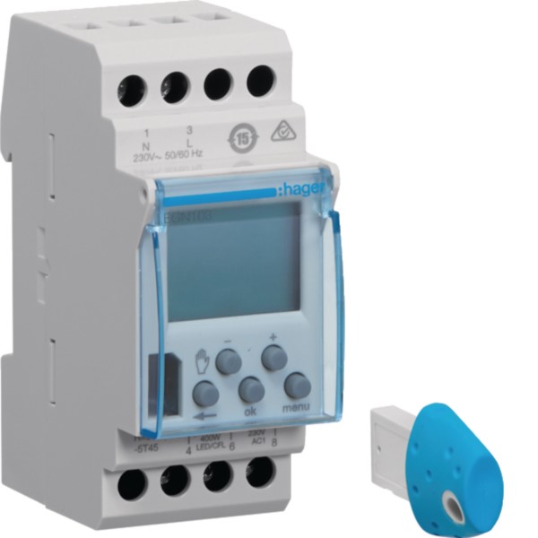 Digitale Wochenschaltuhr mit 1 Wechsler, 16 Ampere, 2 Platzeinheiten, inklusive Bluetooth-Programmierschlüssel. Ermöglicht zeitabhängige Steuerungen und automatische Sommer-/Winterzeitumstellung. App-Programmierung und manuelle Einstellung direkt am Gerät mit sperrbarer Tastatur. Integrierte Gangreserve für Programmierung ohne Netzspannung. Geeignet für Reiheneinbau auf Hutschiene. Bluetooth 4.2 für effiziente Konfiguration.- Hersteller-Artikelnummer (MPN)