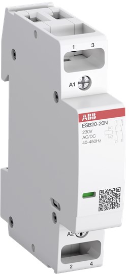 2-polige Schütze ESB20..N mit 18 mm Baubreite steuern 1-phasige Lasten bis 20 A und stehen in unterschiedlichen Kontaktbelegungen und Spulenspannungen zur Verfügung. Sie schalten elektrische Heizgeräte, Warmwasserbereiter, Motoren für Pumpen, Lüftung und sonstige Antriebe ebenso wie Beleuchtungen. Durch eine integrierte Spulenbeschaltung arbeiten sie sowohl mit AC- als auch mit DC-Steuerspannungen. Die Geräte sind deshalb absolut brummfrei und leise beim Schalten. Sie können ohne Abstand nebeneinander angereiht werden. Ein als Zubehör linksseitig anbaubarer Hilfsschalter ergänzt das Sortiment. ESB20..N haben Installationsdesign und erfüllen u.a. die Haushaltsnorm EN61095. Sie sind daher besonders geeignet für den Verteilereinbau.- Hersteller-Artikelnummer (MPN)