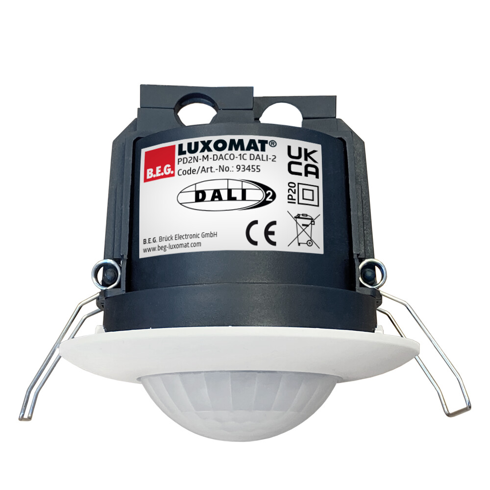 Präsenzmelder mit integriertem DALI-Applikations-Controller für eine energieeffiziente Lichtsteuerung, DALI-2 zertifiziertes Produkt, Integrierte DALI-Spannungsversorgung, DALI-Schnittstelle zur Ansteuerung digitaler, dimmbarer EVG im Broadcast-Verfahren, Manuelles Schalten und Dimmen über konventionelle Taster möglich, Bidirektionale IR-Kommunikation ermöglicht schnelle Integration in die Projektverwaltungsfunktion der B.E.G. One App, Voller Funktionsumfang ist nur mit dem BLE-IR-Adapter und einem Smartphone oder Tablet (Android, iOS) aktivierbar, Halbautomatik-, Vollautomatik-, Lichtregler- oder Anwesenheits-Betrieb einstellbar, Leistungsstarkes Schaltrelais mit verschiedenen Betriebsarten, wie z.B. Cutoff-Funktion für DALI-EVG, HKL, Tafelbeleuchtung., Intelligenter Regelalgorithmus mit umfangreichen Einstellmöglichkeiten, Software ist rückwärtskompatibel zur ersten Generation (außer DSI, Doppelschloss und Korridorfunktion), Werkseinstellung 10 min Nachlaufzeit und 500 Lux Helligkeitssollwert, Inklusive vormontierter Federklemme mit Zugentlastung und Berührschutzkappe für die Deckeneinbau-Montage, Zubehör für Aufputzmontage optional erhältlich