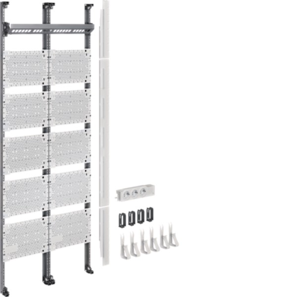 Das Komplettfeld Multimedia univers Z, 1350mm, 2-feldig, gemäß DIN 43870, ist für den Einbau in Zählerschranksysteme konzipiert und erlaubt eine werkzeuglose Schnellmontage. Es beinhaltet ein Traggerüst mit Tragschienen, eine gelochte Montageplatte und ein isoliert montiertes Patchpanel für bis zu 24 Ports. Zusätzlich sind drehbare 3-fach Schutzkontaktsteckdosen und Multimedia-Gerätehalter für VDI-Komponenten integriert. Beachten Sie, dass geschirmte Datenmodule RJ45 Kat.6 nicht inkludiert sind.