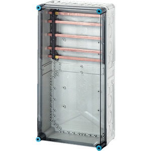 Gehäuse für den Bau von Energie-Schaltgerätekombinationen bis 630 A oder als Einzelgehäuse. Aus hochwertigem Polycarbonat schutzisoliert. Wanddurchführungen mit großen Öffnungen für die elektrische Verbindung der Gehäuse untereinander. Kabeleinführung an allen Gehäusewänden über metrische Vorprägungen oder Anbauflansche. Gehäuse zur Wandbefestigung auch über Außenlaschen oder mit Montageschienen. Gehäuse mit Sammelschienen, ohne Gerät, ohne Klemmen. Deckelverschlüsse für Werkzeugbetätigung.