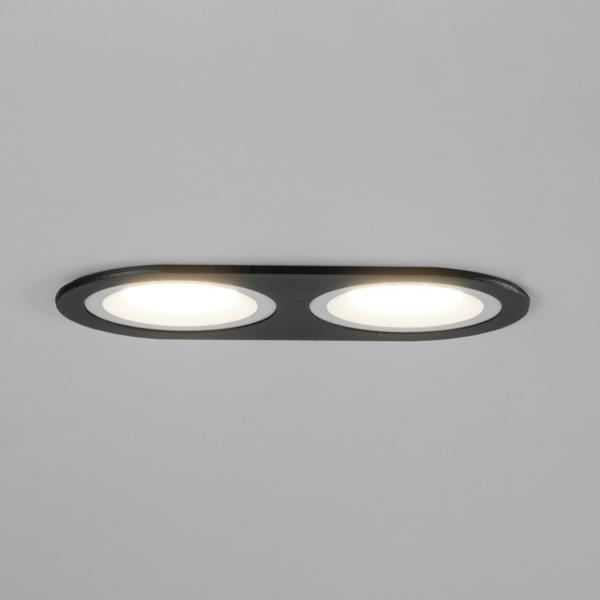 Einbaugehäuse, oval, bündig, 2-fach, mit Modulhalterungen bündig, starr, IP44, ohne LED-Module, außen strukturschwarz / innen strukturweiß , oval. Ausgeführt in kompakter Bauform für werkzeuglose Schnellmontage zum Deckeneinbau. Alle Brumberg MR16-LED-Module sind für die Einbaueinheit M1 bis zur maximal angegebenen Leistung einsetzbar. Die Einbautiefe der Leuchte richtet sich nach den jeweils verwendeten LED-Modulen. Die LED-Module sind im Lieferumfang der Einbaueinheit nicht enthalten. Ausführung: ohne Fassung, Montageart: Einbaumontage, Montageort: Deckenmontage, Material: Aluminium, Schutzart raumseitig: nach DIN EN 60529: IP44, Schutzklasse: (EN 61140) III, Leistung: 13 W, Anzahl der Leuchtmittel / Fassungen: 2 Stück, Verstellbarkeit: nicht verstellbar, ohne Betriebsgerät, Dimmbar: Abhängig vom Betriebsgerät, Art der Dimmung: Abhängig vom Betriebsgerät.