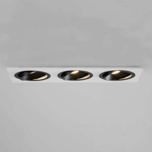 Einbaugehäuse, rechteckig, bündig, 3-fach, mit Modulhalterungen vertieft, schwenkbar, ohne LED-Module, außen strukturweiß / innen strukturschwarz, quadratisch. Ausgeführt in kompakter Bauform für werkzeuglose Schnellmontage zum Deckeneinbau. Alle Brumberg MR16-LED-Module sind für die Einbaueinheit M1 bis zur maximal angegebenen Leistung einsetzbar. Die Einbautiefe der Leuchte richtet sich nach den jeweils verwendeten LED-Modulen. Die LED-Module sind im Lieferumfang der Einbaueinheit nicht enthalten. Ausführung: ohne Fassung, Montageart: Einbaumontage, Montageort: Deckenmontage, Material: Aluminium, Schutzart raumseitig: nach DIN EN 60529: IP20, Schutzklasse: (EN 61140) III, Leistung: 13 W, Anzahl der Leuchtmittel / Fassungen: 3 Stück, Verstellbarkeit: schwenkbar, ohne Betriebsgerät, Dimmbar: Abhängig vom Betriebsgerät, Art der Dimmung: Abhängig vom Betriebsgerät.