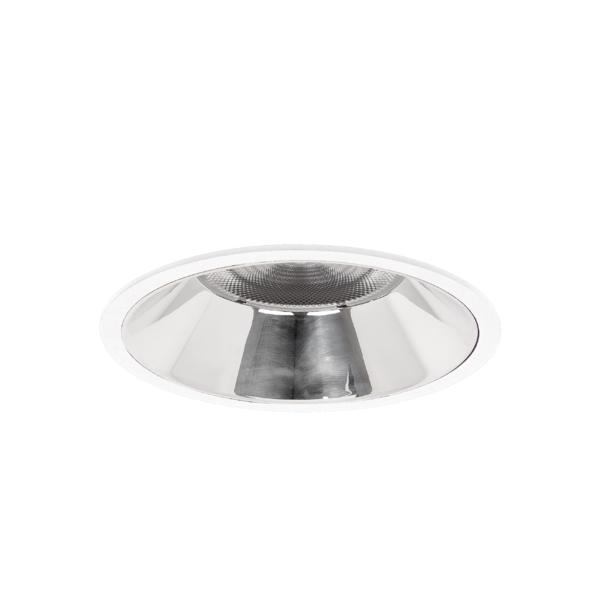 LED-Einbaudownlight, schaltbar, Reflektor silber, hochglänzend, strukturweiß, rund. Ausgeführt in kompakter Bauform für werkzeuglose Schnellmontage zum Deckeneinbau. Ausführung: ohne Fassung, Montageart: Einbaumontage, Montageort: Deckenmontage, Material: Aluminium / Glas / Kunststoff, Schutzart raumseitig: nach DIN EN 60529: IP20, Schutzklasse: (EN 61140) II, Spannung: 230V AC 50Hz, Leistung: 20,5 W, Anzahl der Leuchtmittel / Fassungen: 1 Stück, Lichtstrom: 2.632 lm, Farbtemperatur: 3.000 K, Lichtfarbe: weiß, Abstrahlwinkel: 55°, Verstellbarkeit: nicht verstellbar, Mit Betriebsgerät: Ja, Art der Dimmung: schaltbar.